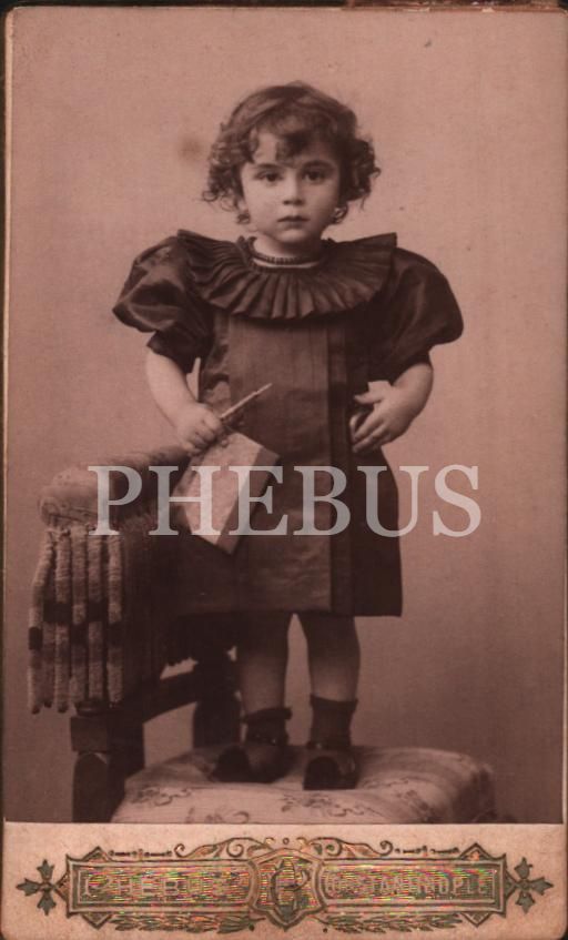 Defter ve kalemiyle poz veren sevimli kız çocuğunun kabin fotoğrafı, Phebus Fotoğrafhanesi- Constantinople, 6x11 cm