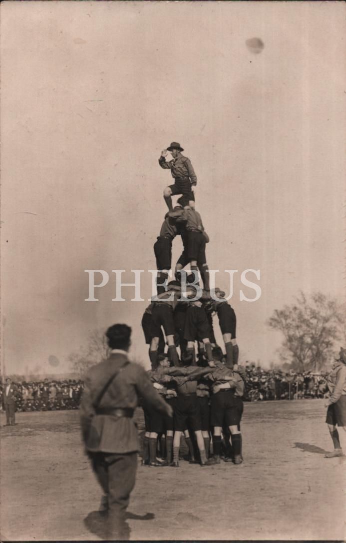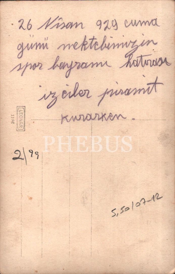 "26 Nisan 1929 Cuma günü mektebimizin spor bayramı hatırası, izciler piramit kurarken", 9x14 cm
