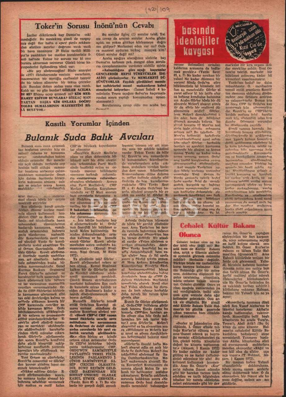 “Milletin iman, ahlak, kültür, tarih ve maddi çıkarlarına bağlı bir siyasi millî dava dergisi” YENİDEN MİLLİ MÜCADELE´nin 145. sayısı, Kasım 1972, 27x37 cm