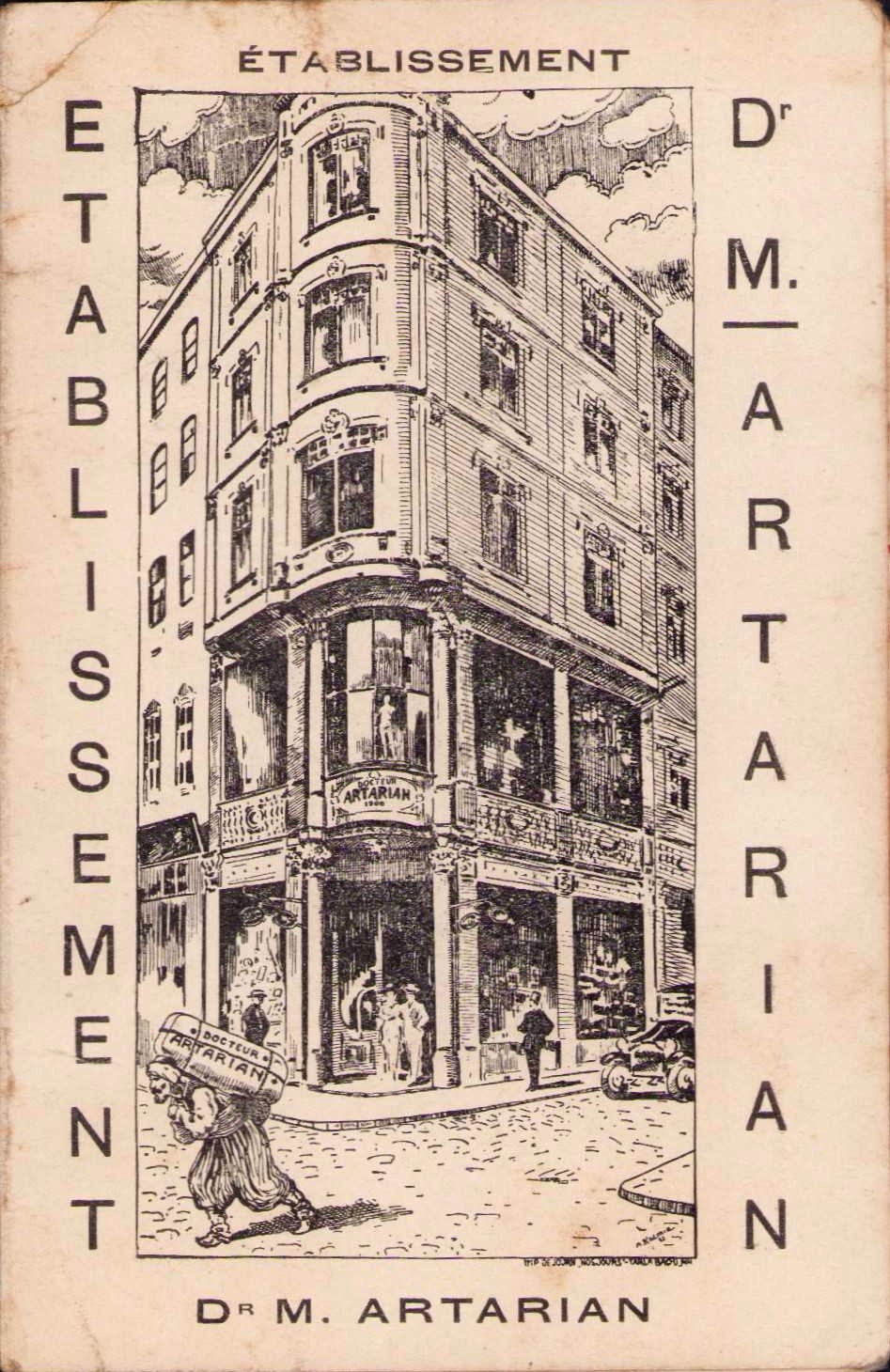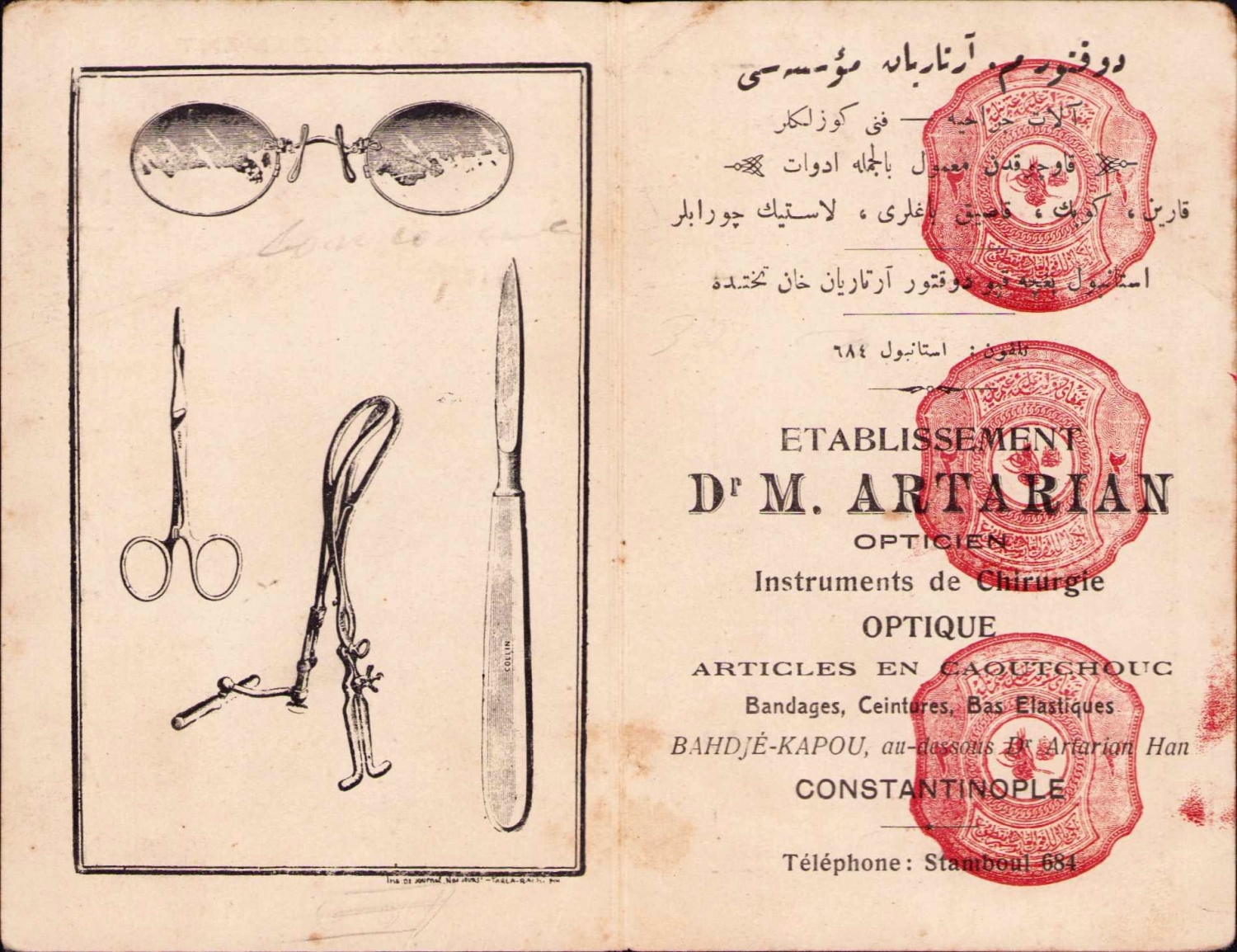 Gözlük ve tıb aletleri satıcısı Ermeni Doktor M. Artaryan'ın iş yeri kartı, 8x12 cm.