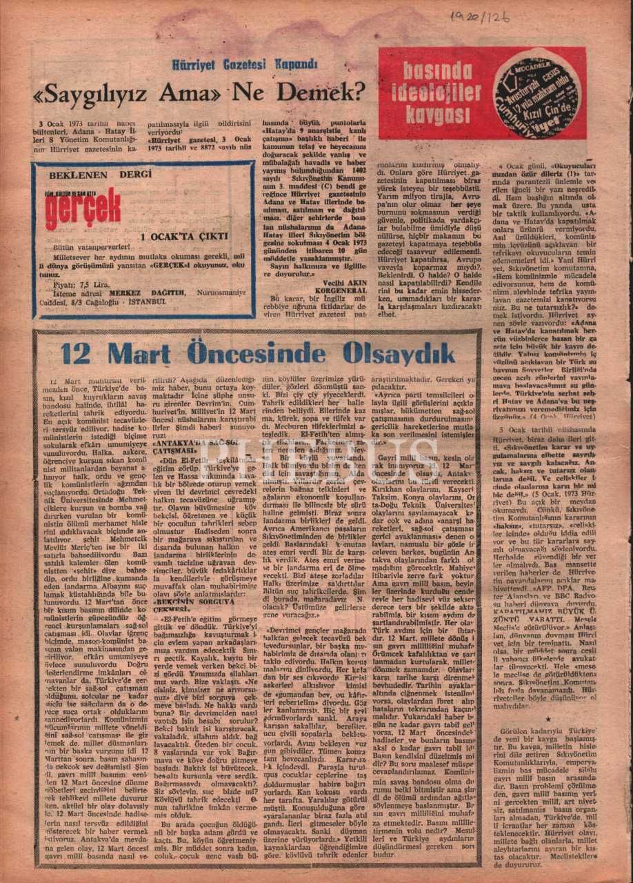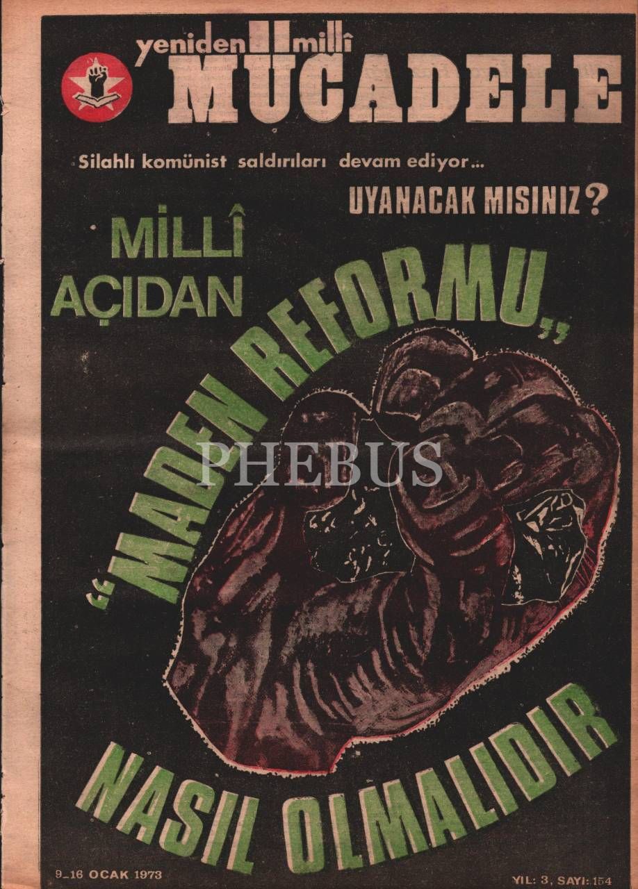 “Milletin iman, ahlak, kültür, tarih ve maddi çıkarlarına bağlı bir siyasi millî dava dergisi” YENİDEN MİLLİ MÜCADELE´nin 154. sayısı, Ocak 1973, 27x37 cm