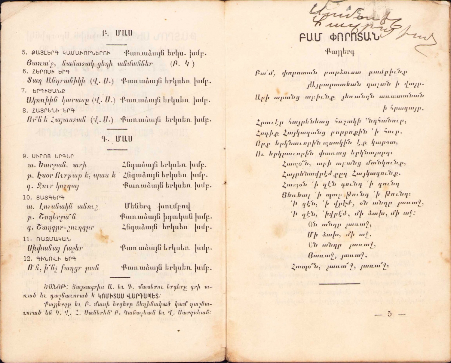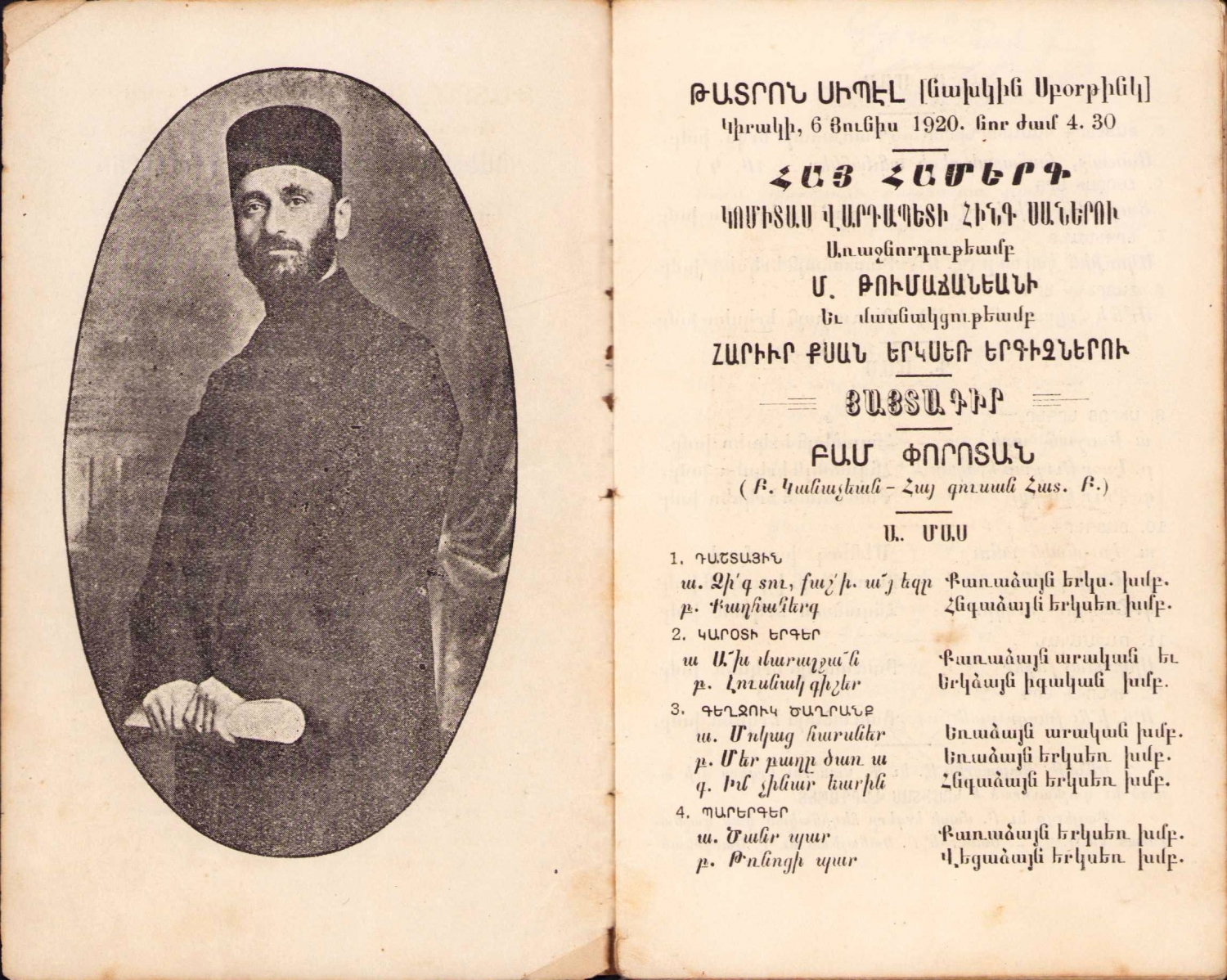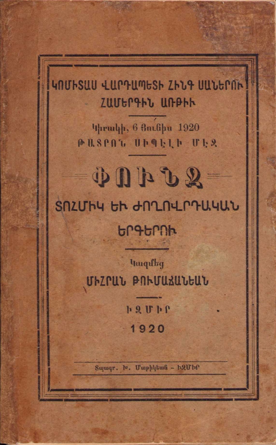 Gomidas Vartabed'in bir öğrencisinin resitali, Ermenice İzmir Ananesinin Halk Ezgileri, İzmir, 1920, 28 sayfa, 9,5x15,5 cm.