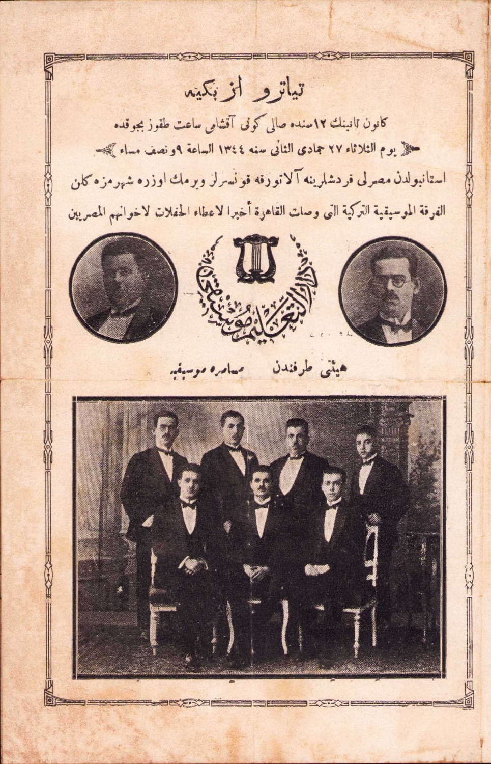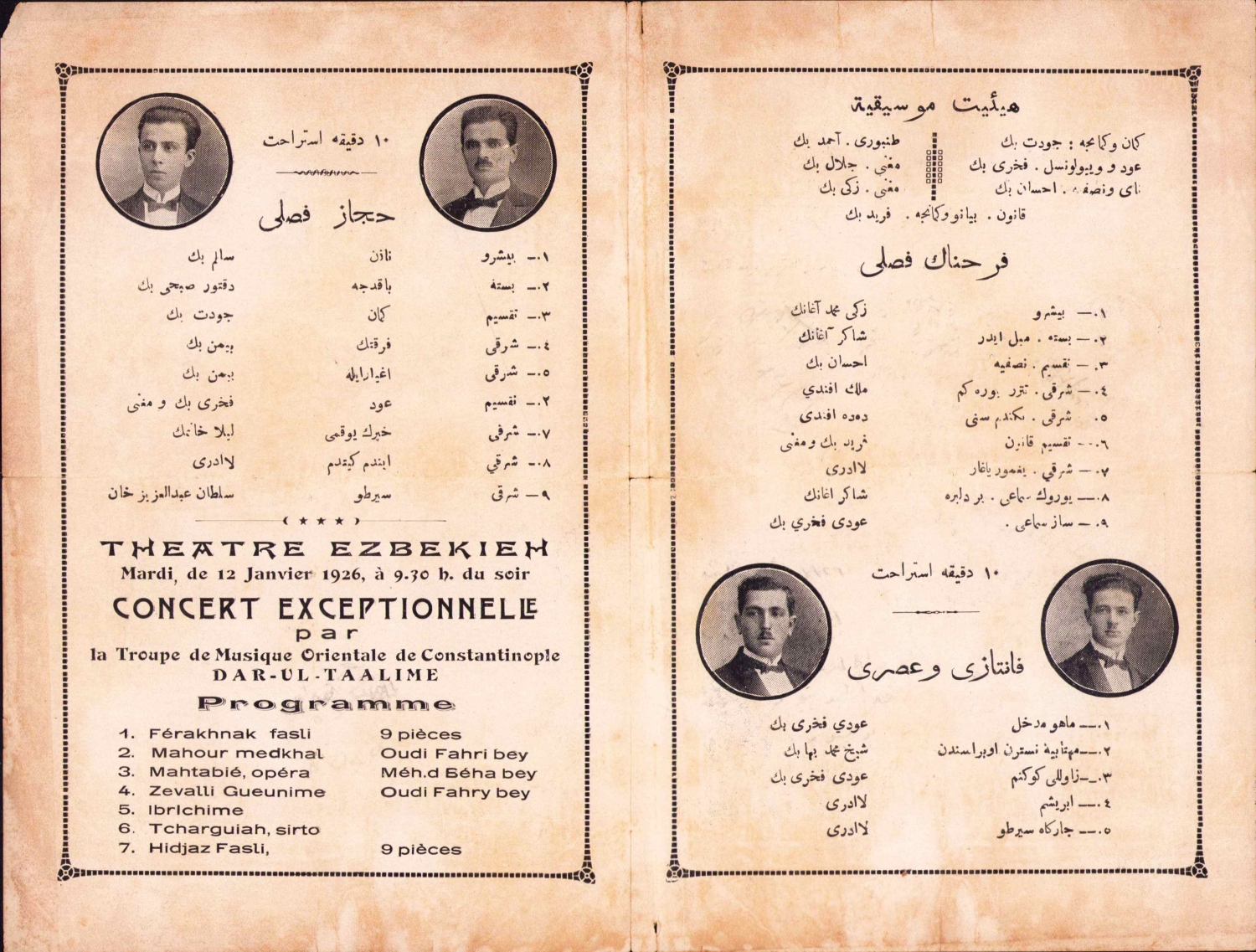 Darüttalim Musiki Cemiyeti heyeti tarafından Ezbekiyeh Tiyatrosu'nda verilen konserin programı, Osmanlıca, Ermenice, Fransızca 1926, 16x24,5 cm.