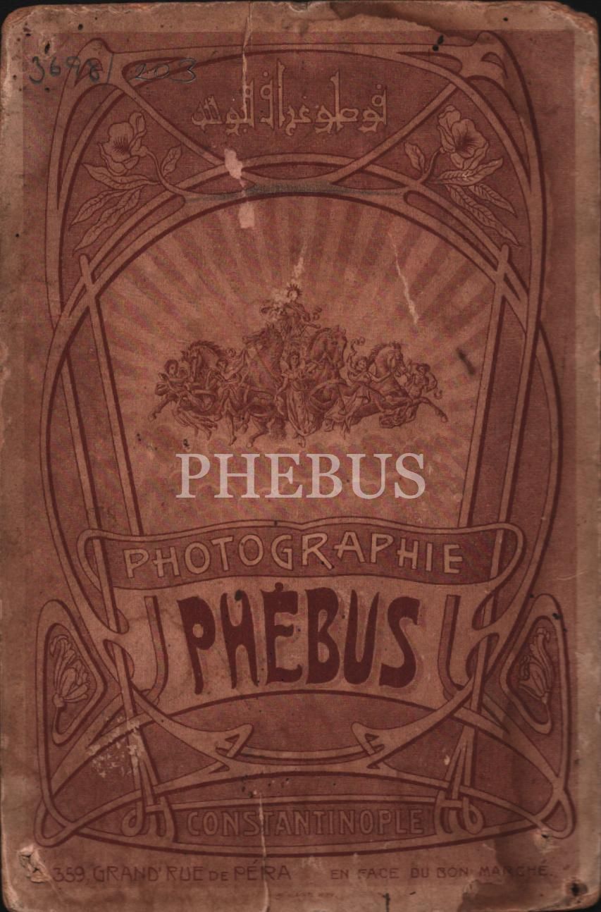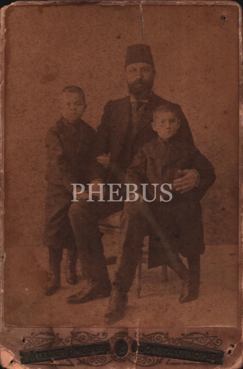 Bir babanın oğulları ile çektirilmiş kabin hatıra fotoğrafı, Phebus Fotoğrafhanesi- Constantinople, 11x17 cm