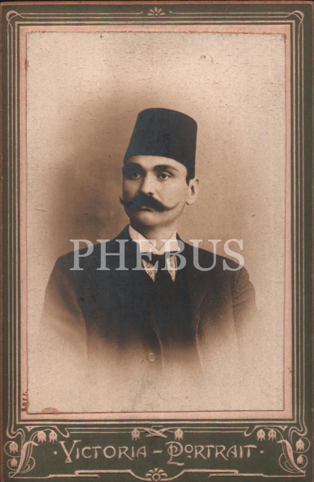 Şık giyimli fesli beyefendinin kabin portre fotoğrafı, Resne Fotoğrafhanesi- İstanbul, 8x12 cm