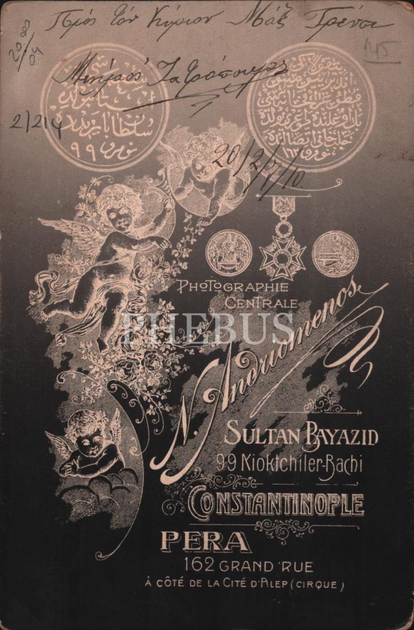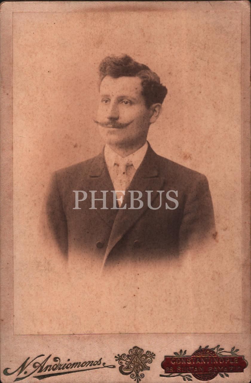 Şık giyimli genç beyefendinin kabin portre fotoğrafı, N. Andriomenos Fotoğrafhanesi- Constantinople, 11x16 cm