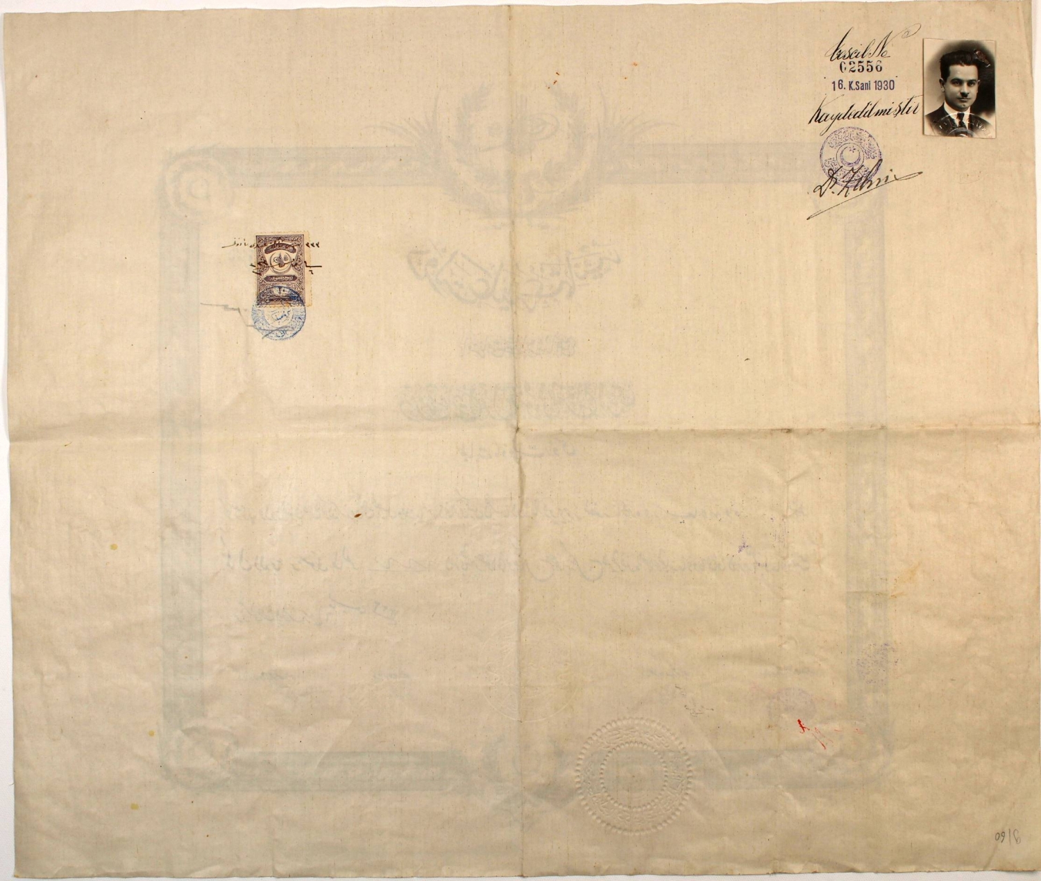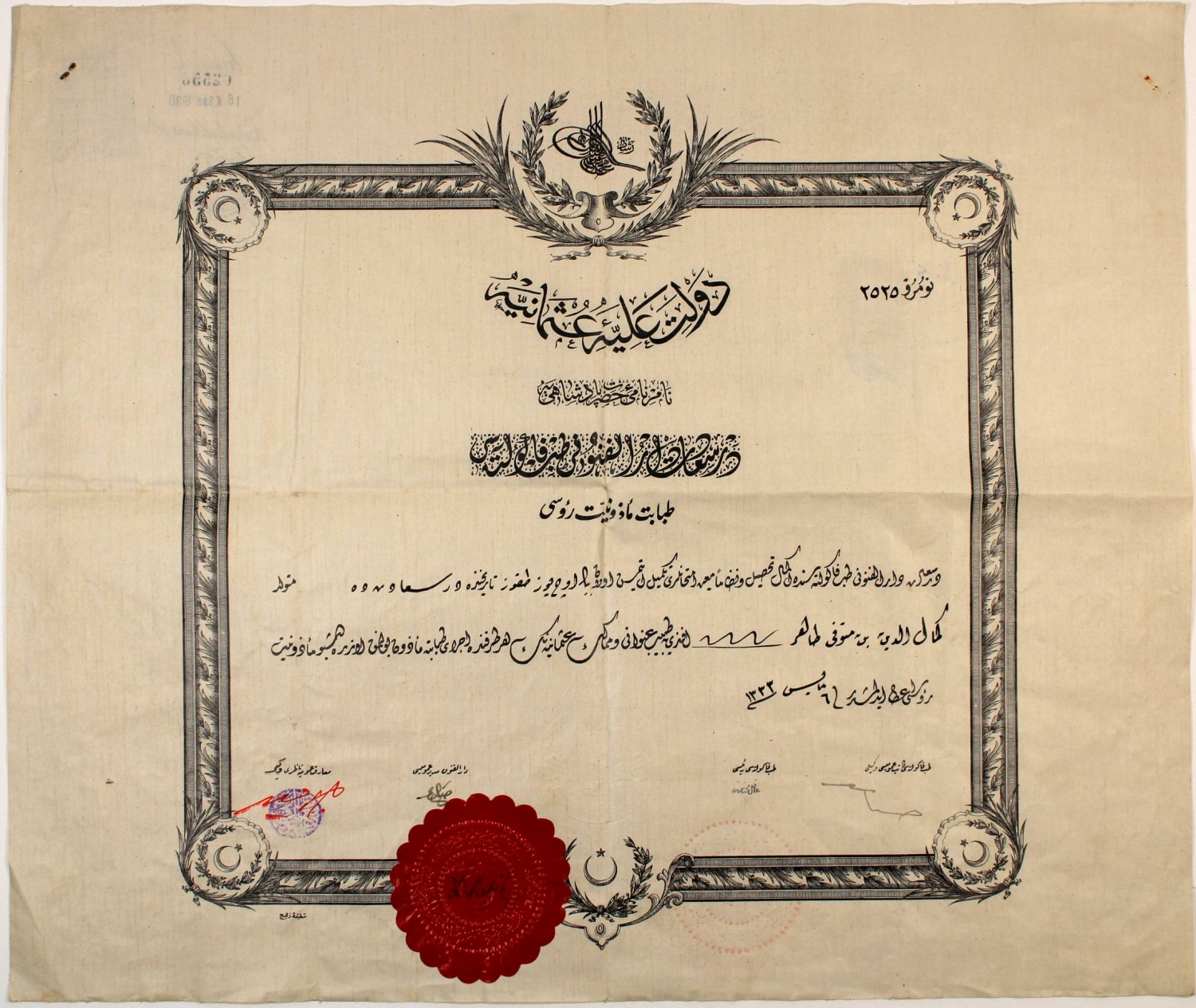 Tabib doktor Kemaleddin Bey'e ait, Dersaadet Darülfunun Tıb Fakültesi Tababet Mezuniyet diploması, 1333, 50x43 cm.