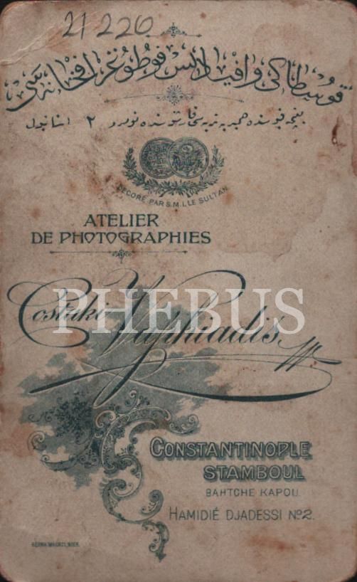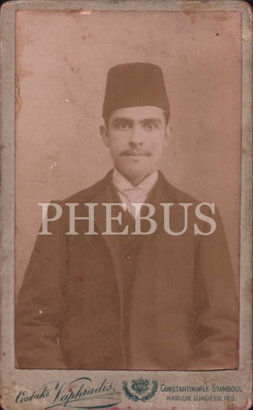 Şık giyimli fesli genç beyefendinin kabin fotoğrafı, Costaki Vaphiadis Fotoğrafhanesi- Constantinople, 6x10 cm