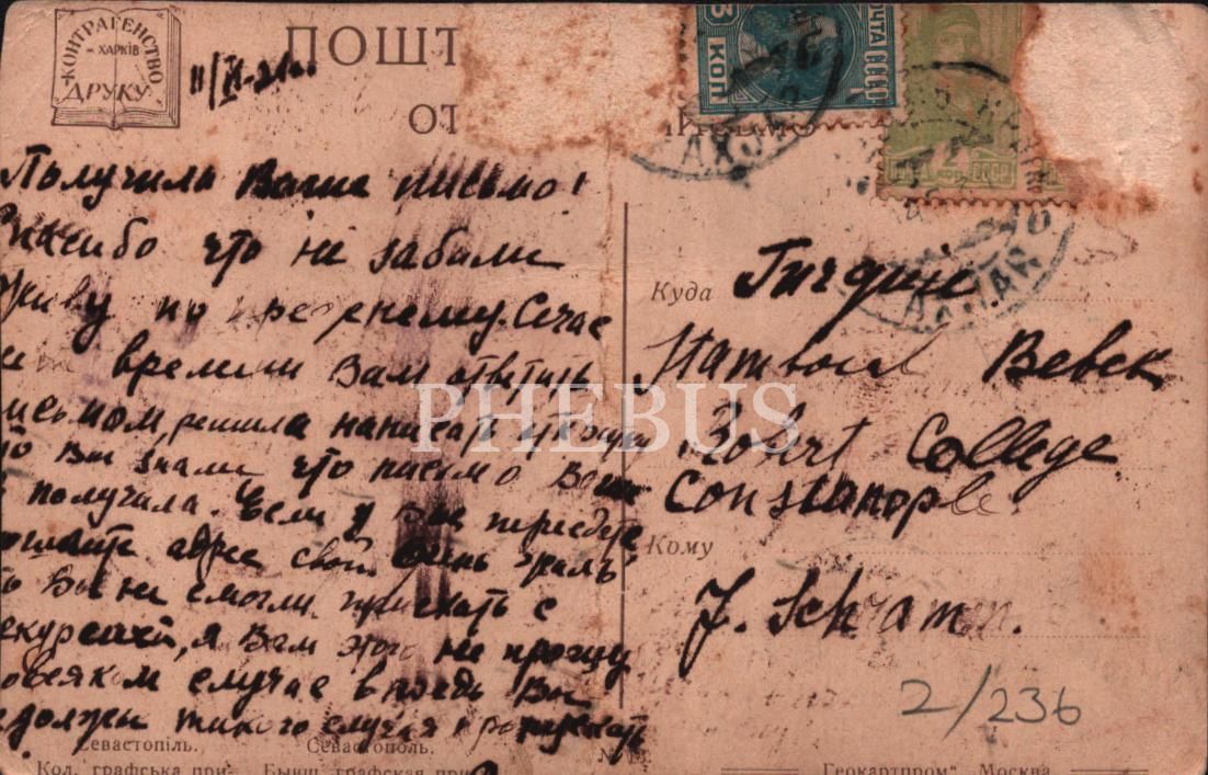 Grafskaya İskelesi/Sivastopol, arkası Rusça yazılı, Galata/İstanbul damgalı postadan geçmiş kartpostal