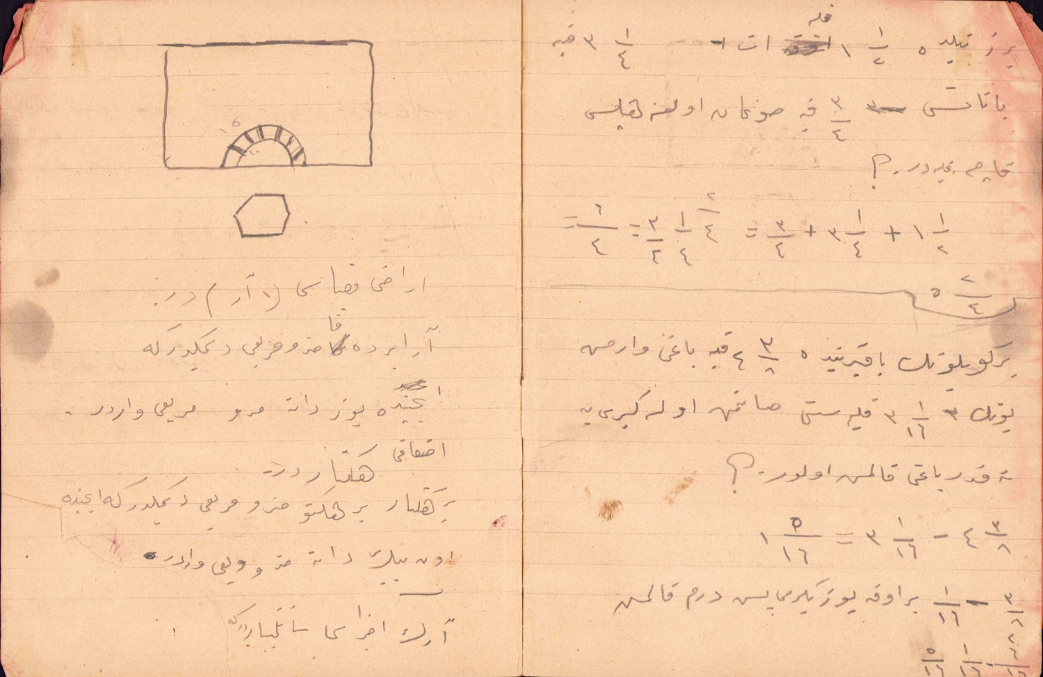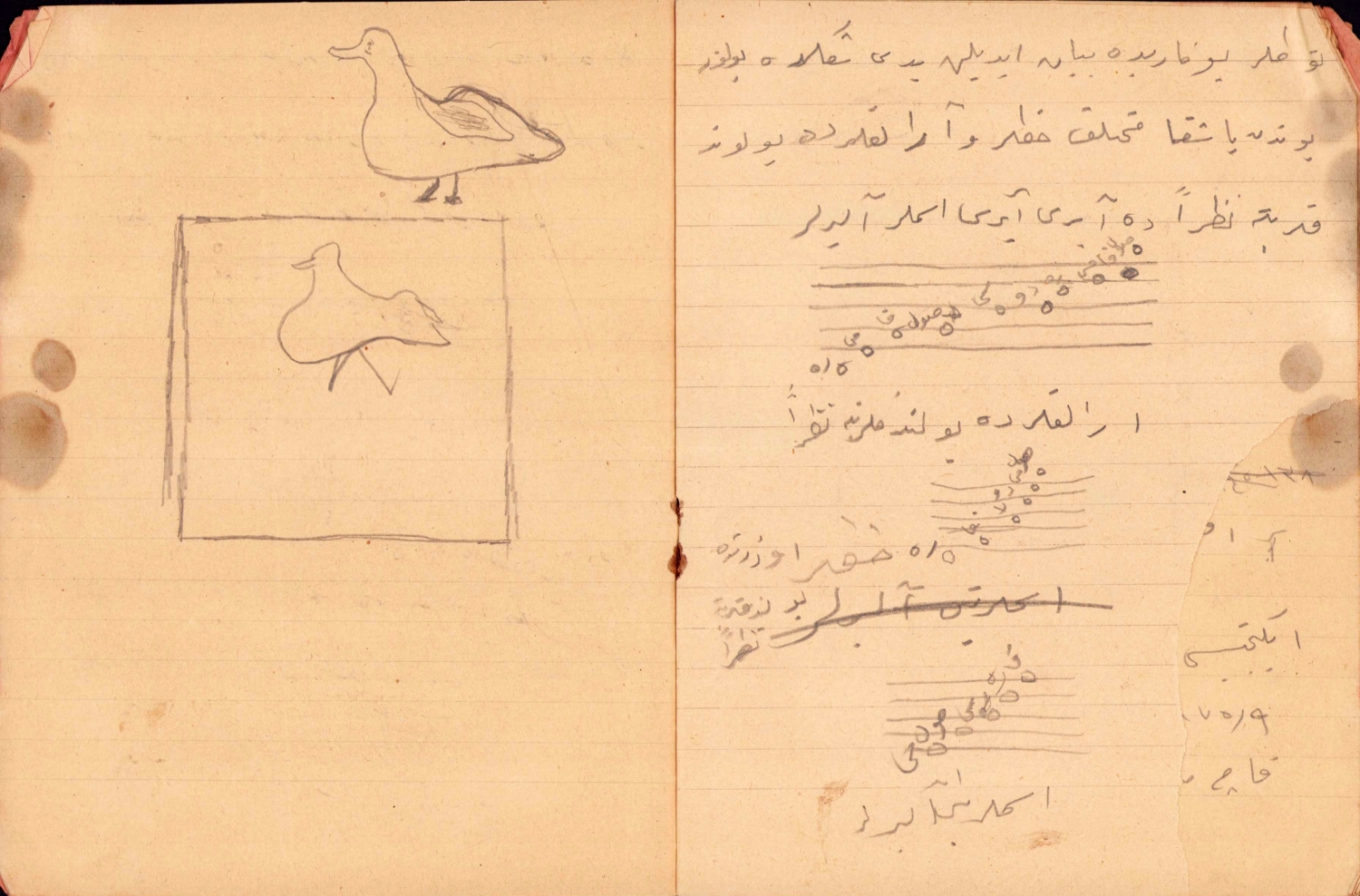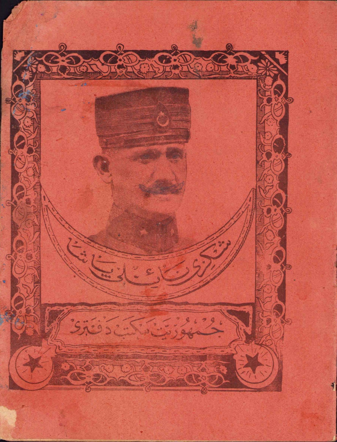 Kapağında Şükrü Naili Paşa'nın fotoğrafı bulunan, Osmanlıca muhtelif notlar ve çizimler barındıran Cumhuriyet Mektebi Defteri, 16 sayfa, 20x15 cm.