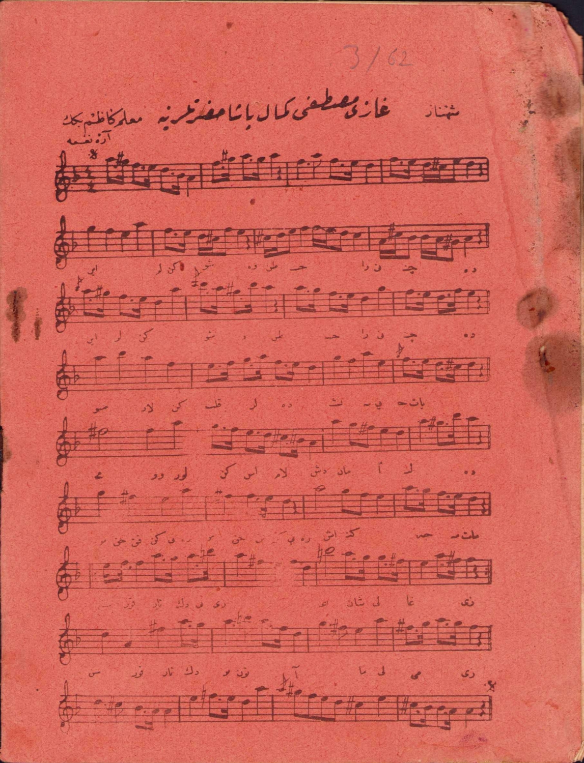 Defterin arkasında Muallim Kazım Bey'in "Gazi Mustafa Kemal Paşa Hazretlerine" başlıklı müzik eserinin notası yer almaktadır.