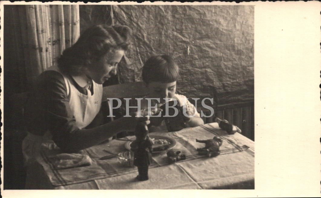Oyuncaklarını kahvaltıda ağırlayan sevimli bebek ve annesi, 9x14 cm