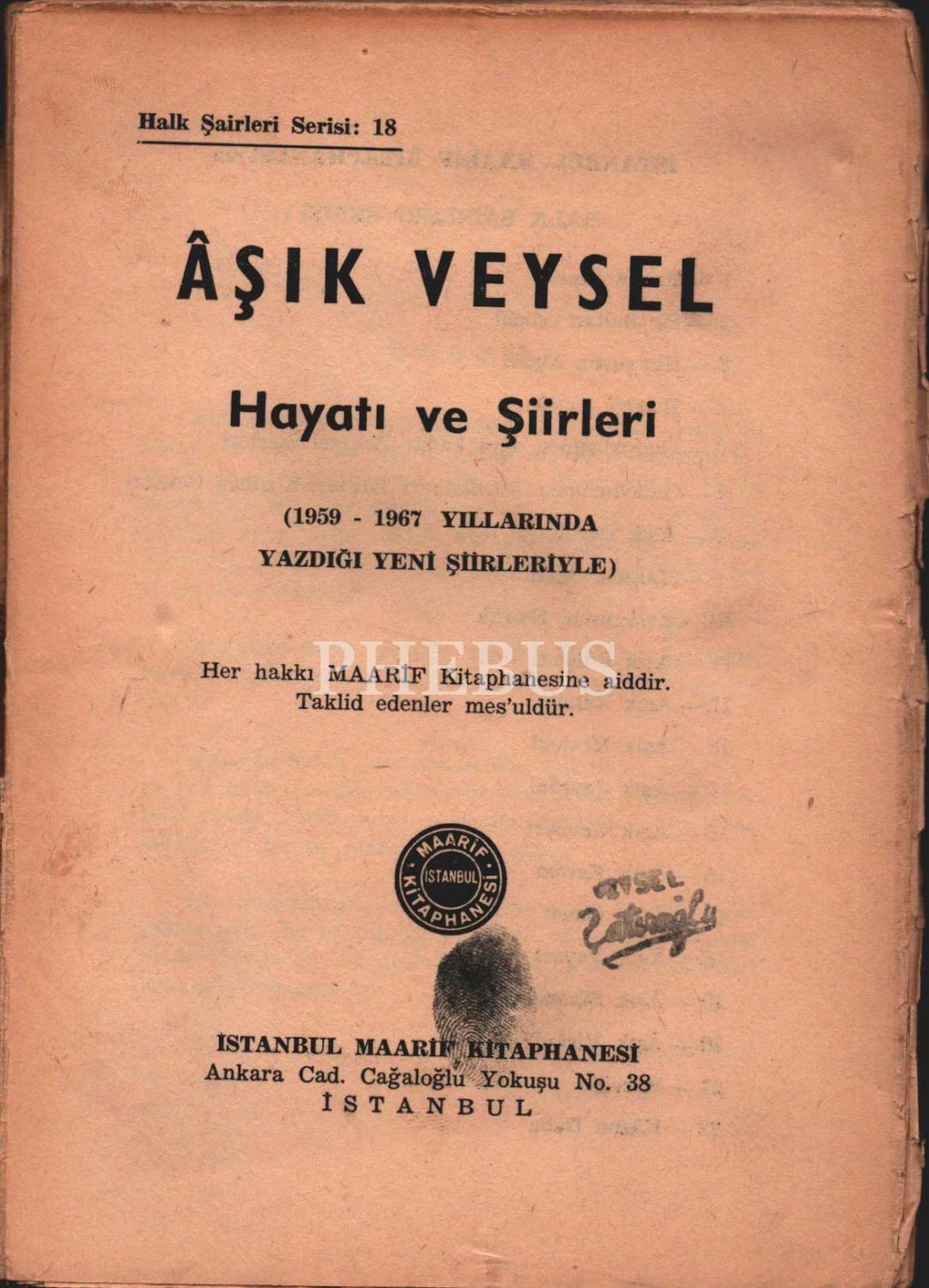 Âşık Veysel Şatıroğlu´nun parmak izi ve mührüyle ÂŞIK VEYSEL (Hayatı ve Şiirleri), İstanbul Maarif Kitaphanesi, 1958, 160 sayfa, 14x20 cm