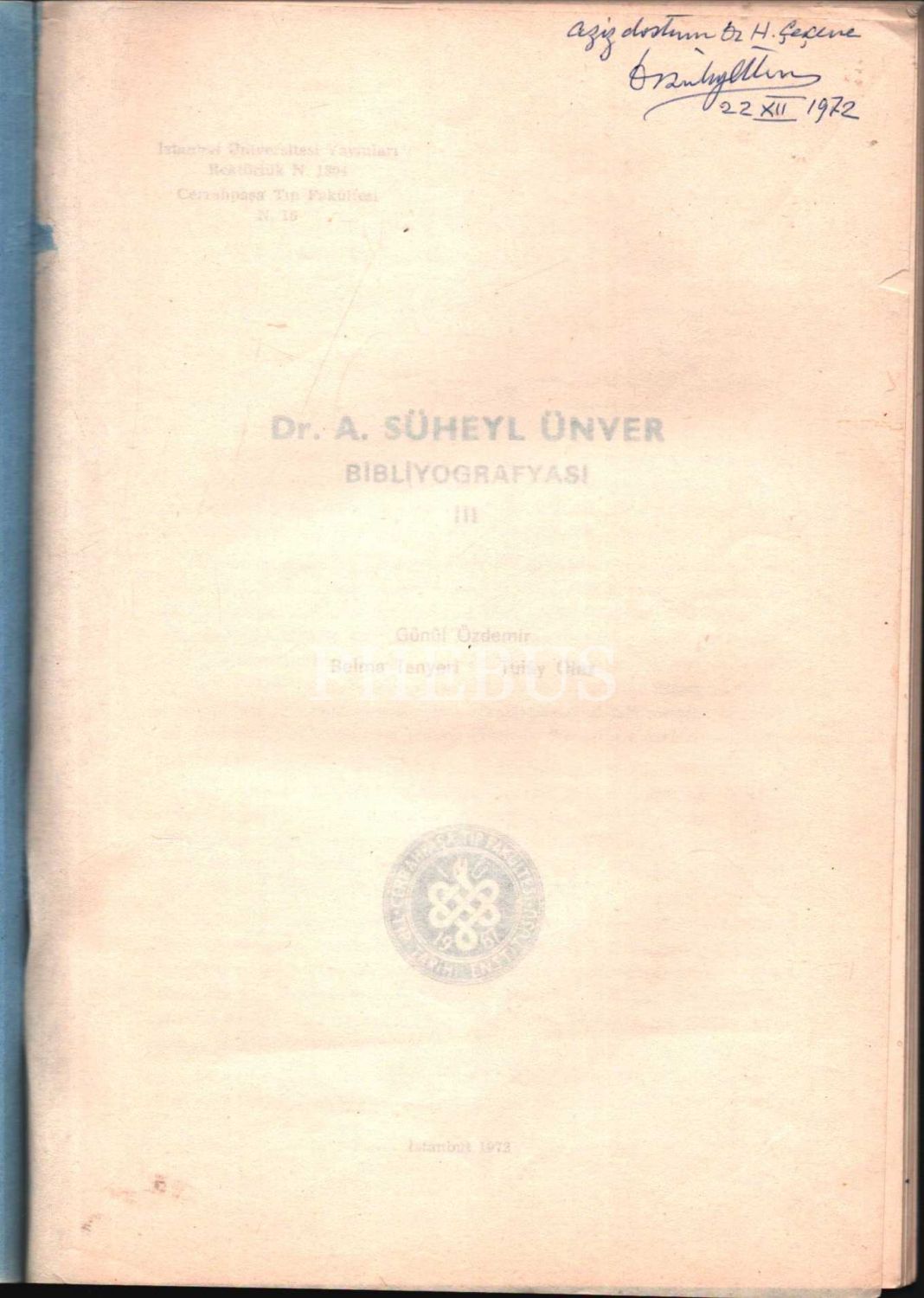 İthaf, "Aziz dostum Dr. H. Çerçine Dr. Süheyl Ünver 22.XII.1972" şeklindedir.