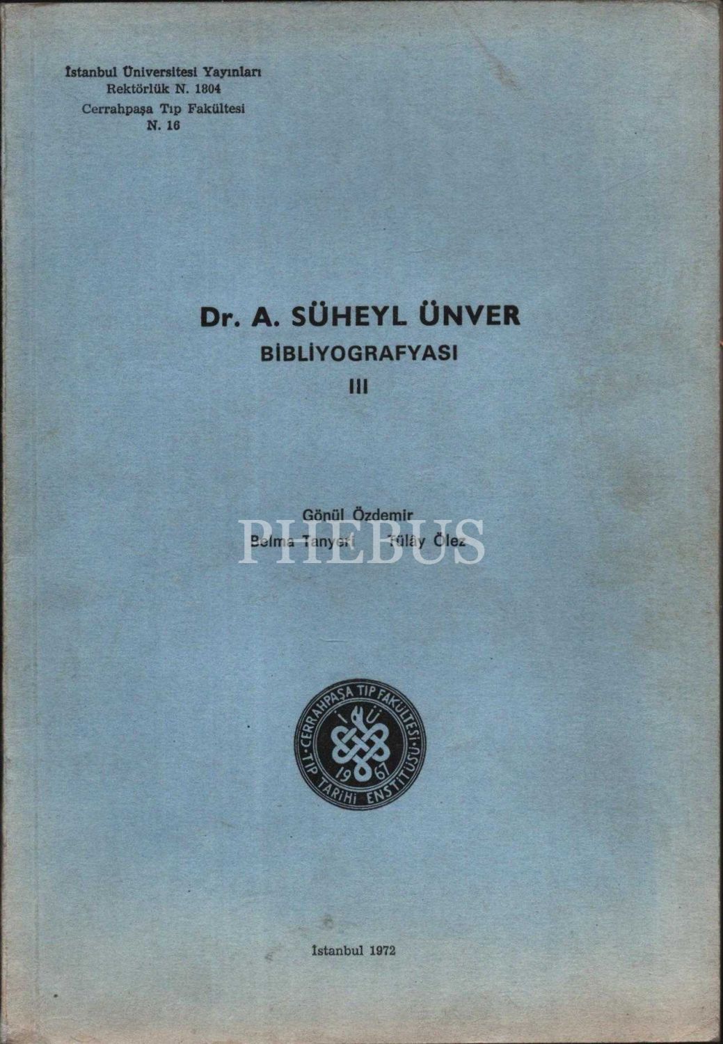 Süheyl Ünver´den ithaflı ve imzalı DR. A. SÜHEYL ÜNVER BİBLİYOGRAFYASI III, Gönül Özdemir, Belma Tanyeri & Tülây Ölez, İstanbul Üniversitesi Yayınları, 1972, 48 sayfa, 16x24 cm