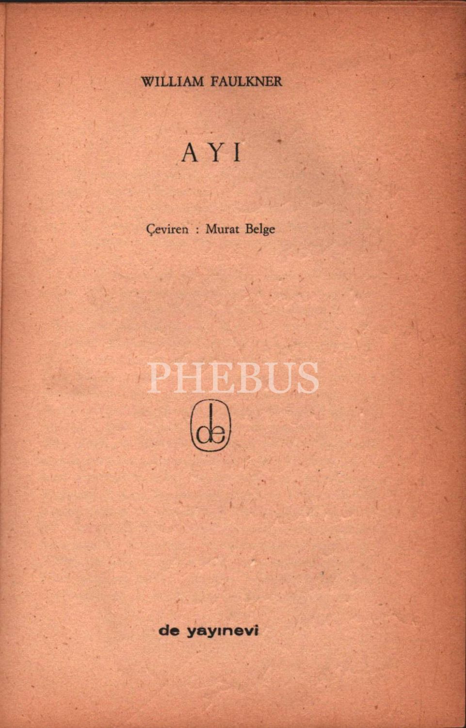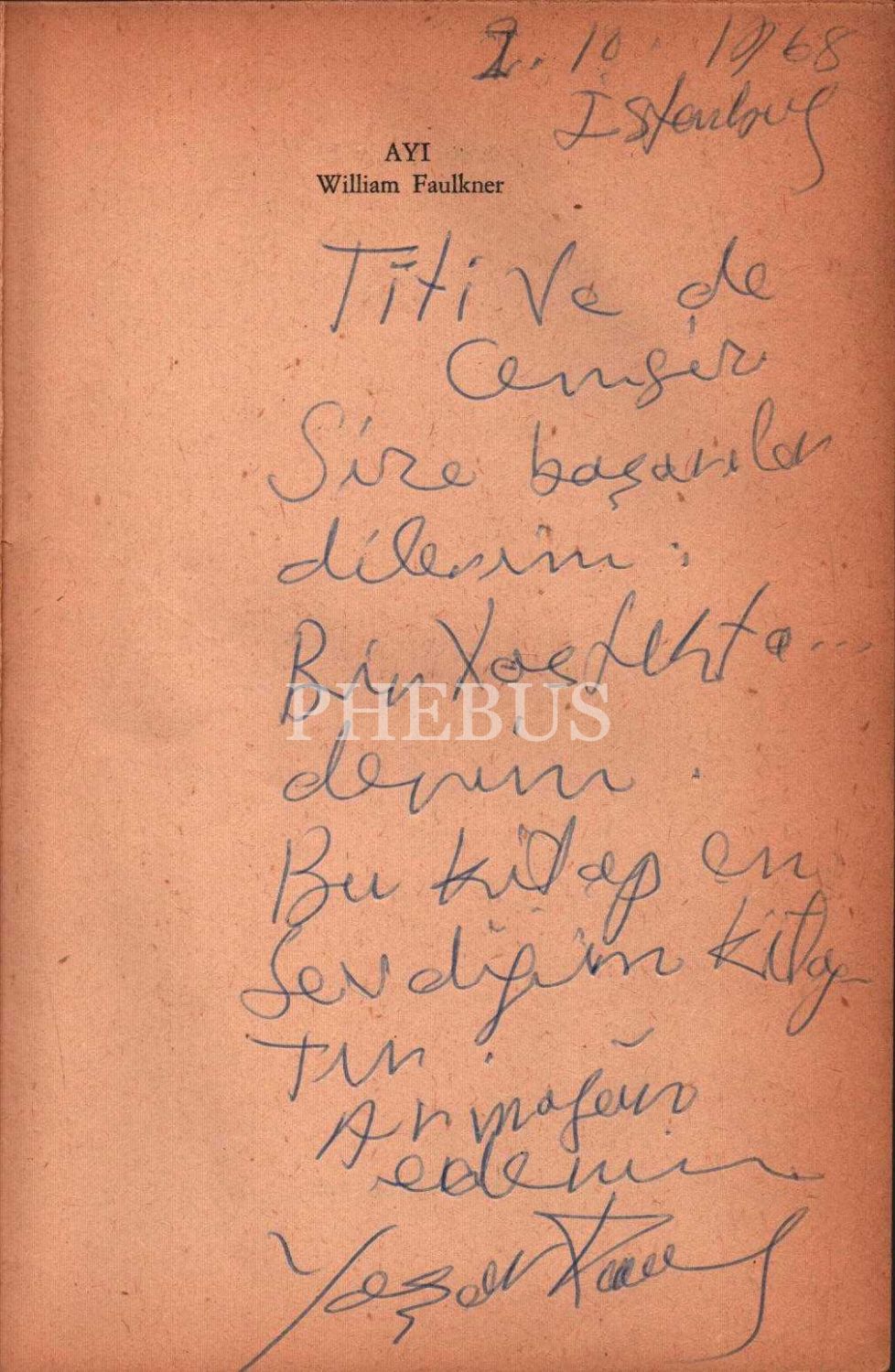 Yaşar Kemal´in "bu kitap en sevdiğim kitaptır" şeklinde ithaflayıp imzaladığı AYI, William Faulker, çeviren: Murat Belge, De Yayınevi, Nisan 1967, 150 sayfa, 14x20 cm