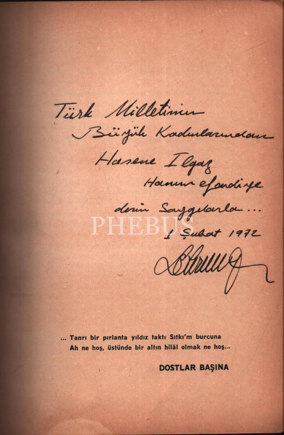 İthaf, "Türk Milletinin Büyük Kadınlarından Hasene Ilgaz Hanımefendiye derin Saygılarla... 1 Şubat 1972 Bekir Sıtkı" şeklindedir.