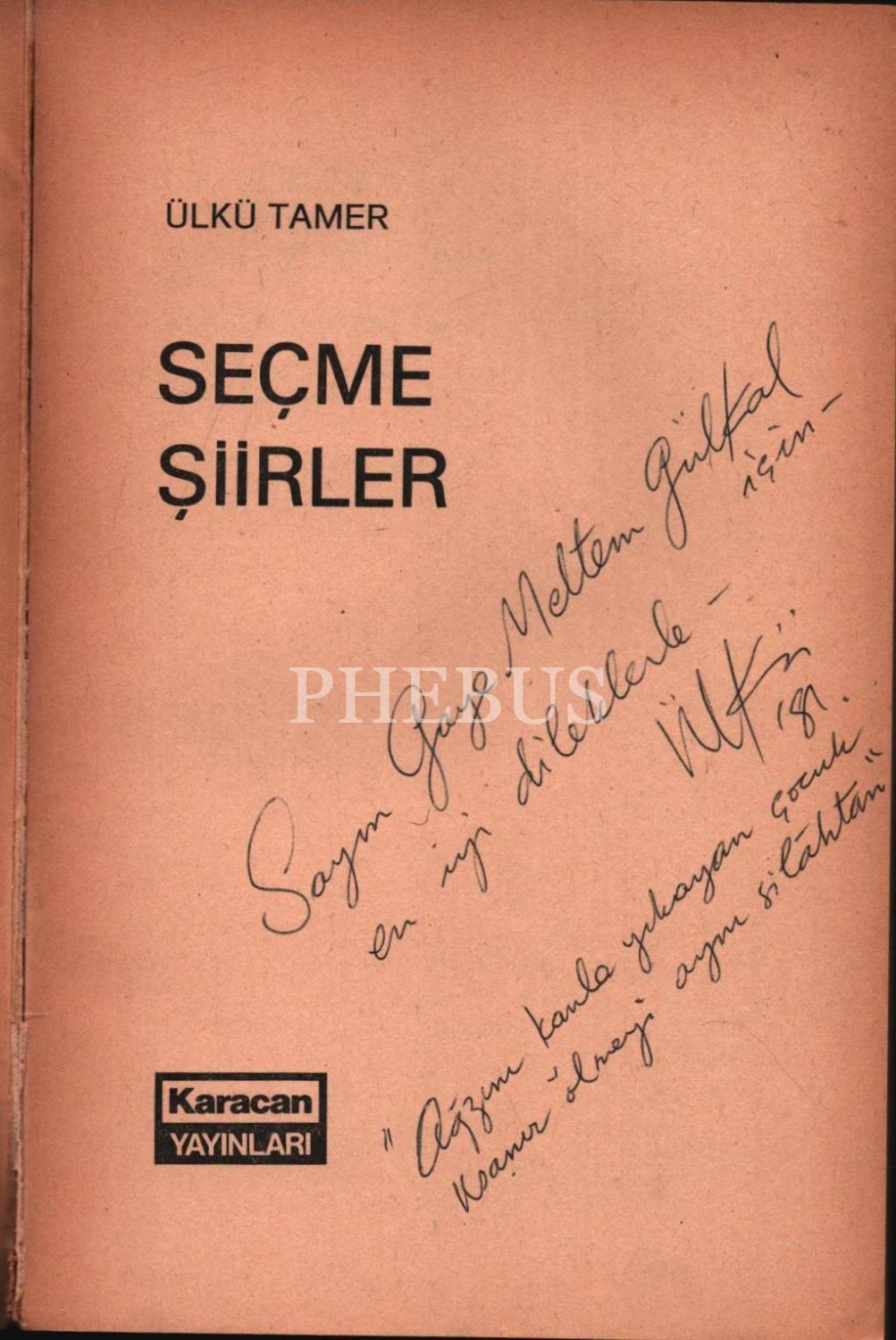 Ülkü Tamer´den ithaflı, imzalı ve şiirli SEÇME ŞİİRLER, Karacan Yayınları, Mart 1981, 189 sayfa, 13x20 cm