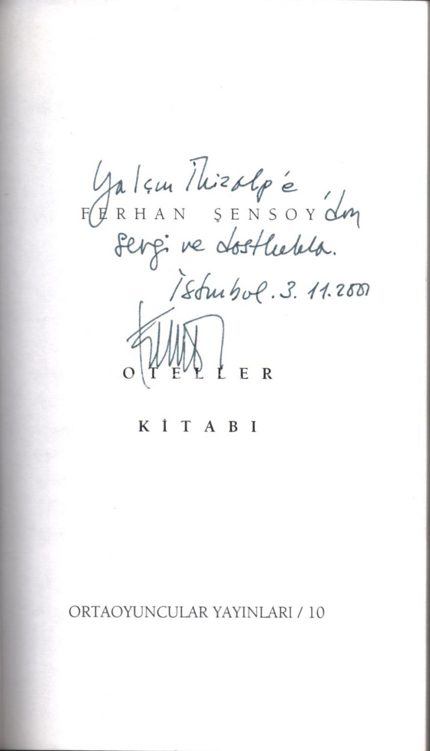 İthaf, "Yalçın İkizalp´e Ferhan Şensoy´dan sevgi ve dostlukla. İstanbul. 3.11.2000" şeklindedir.