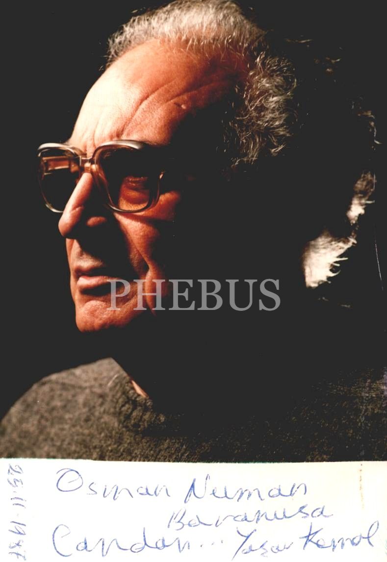 Yaşar Kemal´den Osman Numan Baranus´a ithaflı ve imzalı, 1987 tarihli stüdyo fotoğrafı, "Photo ART - Müslim Şip" damgalı, 10x15 cm