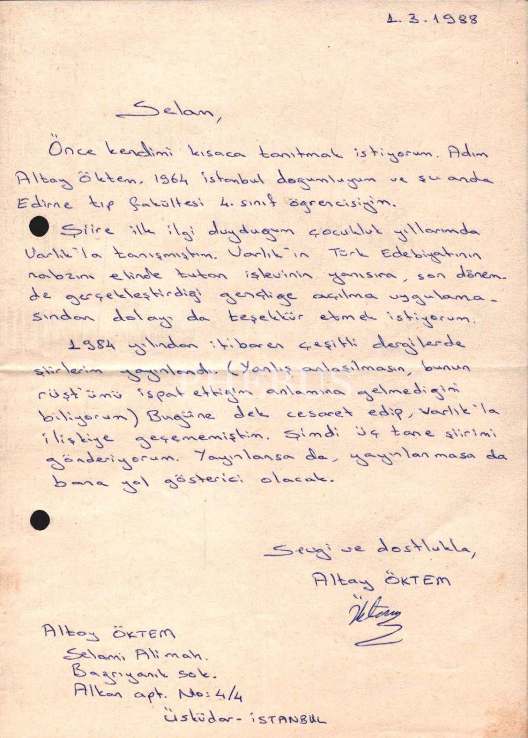 Mektup, "Şiire ilk ilgi duyduğum çocukluk yıllarımda Varlık´la tanışmıştım. Varlık´ın Türk Edebiyatının nabzını elinde tutan işlevinin yanısıra, son dönemde gerçekleştirdiği gençliğe açılma uygulamasından dolayı da teşekkür etmek istiyorum. 1984 yılından itibaren çeşitli dergilerde şiirlerim yayınlandı. (Yanlış anlaşılmasın, bunun rüşt´ümü ispat ettiğim anlamına gelmediğini biliyorum) Bugüne dek cesaret edip, Varlık´la ilişkiye geçememiştim. Şimdi üç tane şiirimi gönderiyorum. Yayınlansa da, yayınlanmasa da bana yol gösterici olacak." ifadelerini içermektedir.