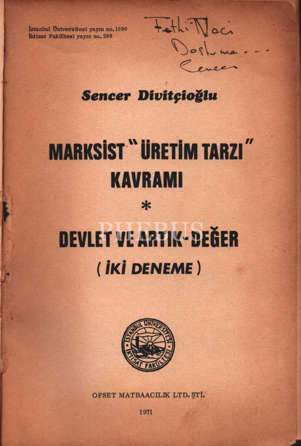 Sencer Divitçioğlu´dan Fethi Naci´ye ithaflı ve imzalı MARKSİST "ÜRETİM TARZI" KAVRAMI / DEVLET VE ARTIK-DEĞER (İki Deneme), İstanbul Üniversitesi İktisat Fakültesi, 1971, 90 sayfa, 16x23 cm