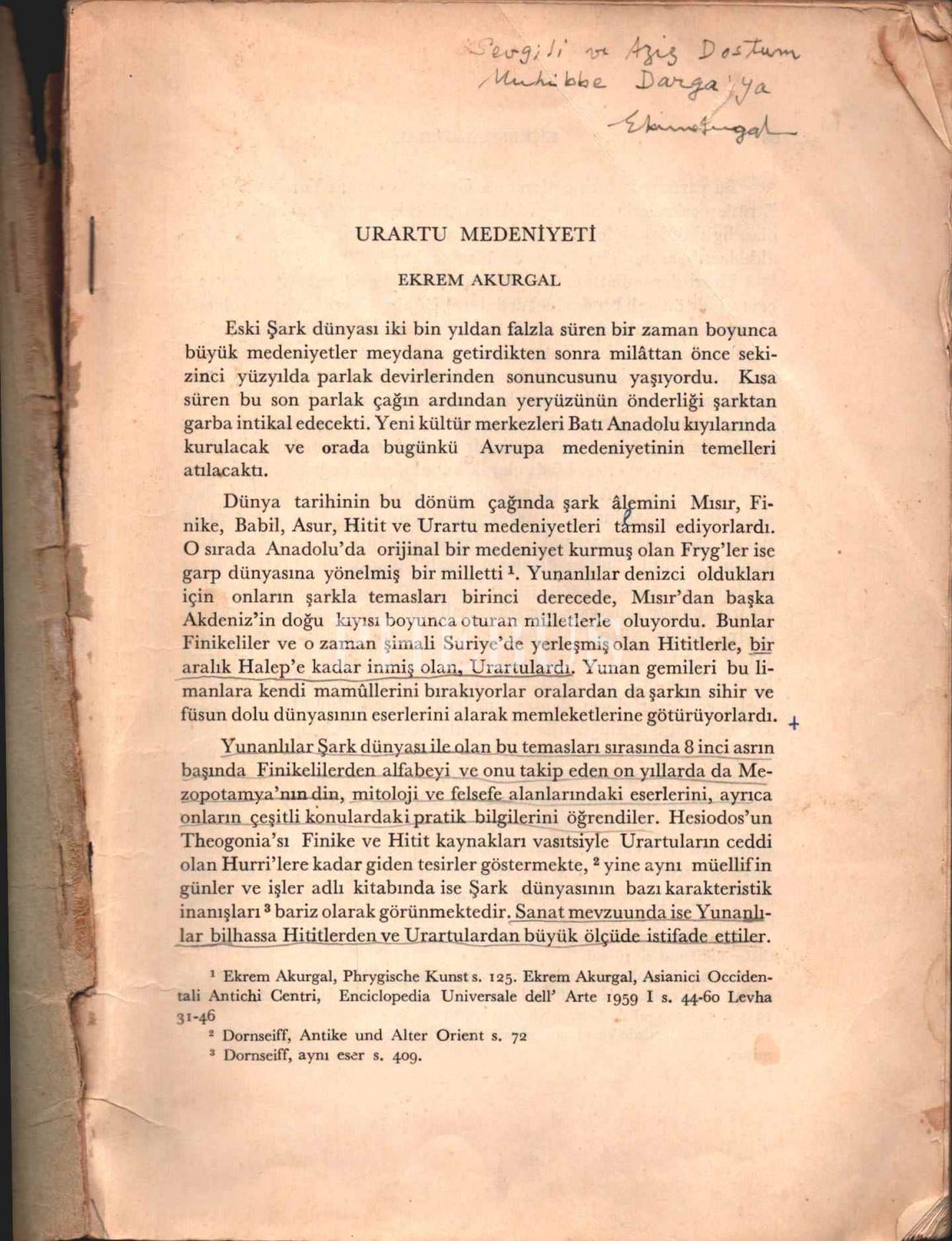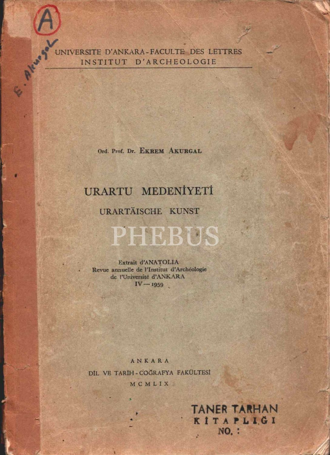 Ekrem Akurgal´dan Muhibbe Darga´ya ithaflı ve imzalı URARTU MEDENİYETİ (Urartaische Kunst), Dil ve Tarih - Coğrafya Fakültesi, Ankara - 1959, 76 sayfa, 17x24 cm