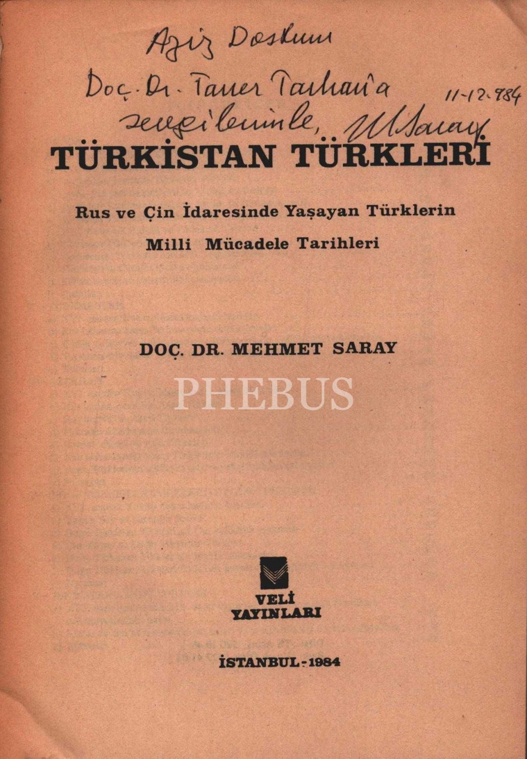 Mehmet Saray´dan ithaflı ve imzalı TÜRKİSTAN TÜRKLERİ (Rus ve Çin İdaresinde Yaşayan Türklerin Milli Mücadele Tarihleri), Veli Yayınları, İstanbul - 1984, 87 sayfa, 17x24 cm