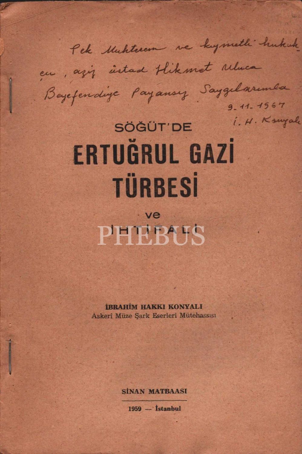İbrahim Hakkı Konyalı´dan ithaflı ve imzalı SÖĞÜT´DE ERTUĞRUL GAZİ TÜRBESİ VE İHTİFALİ, Sinan Matbaası, İstanbul - 1959, 63 sayfa, 17x25 cm