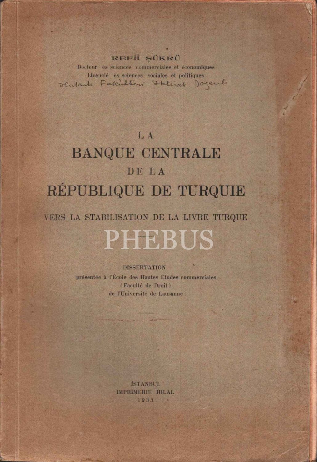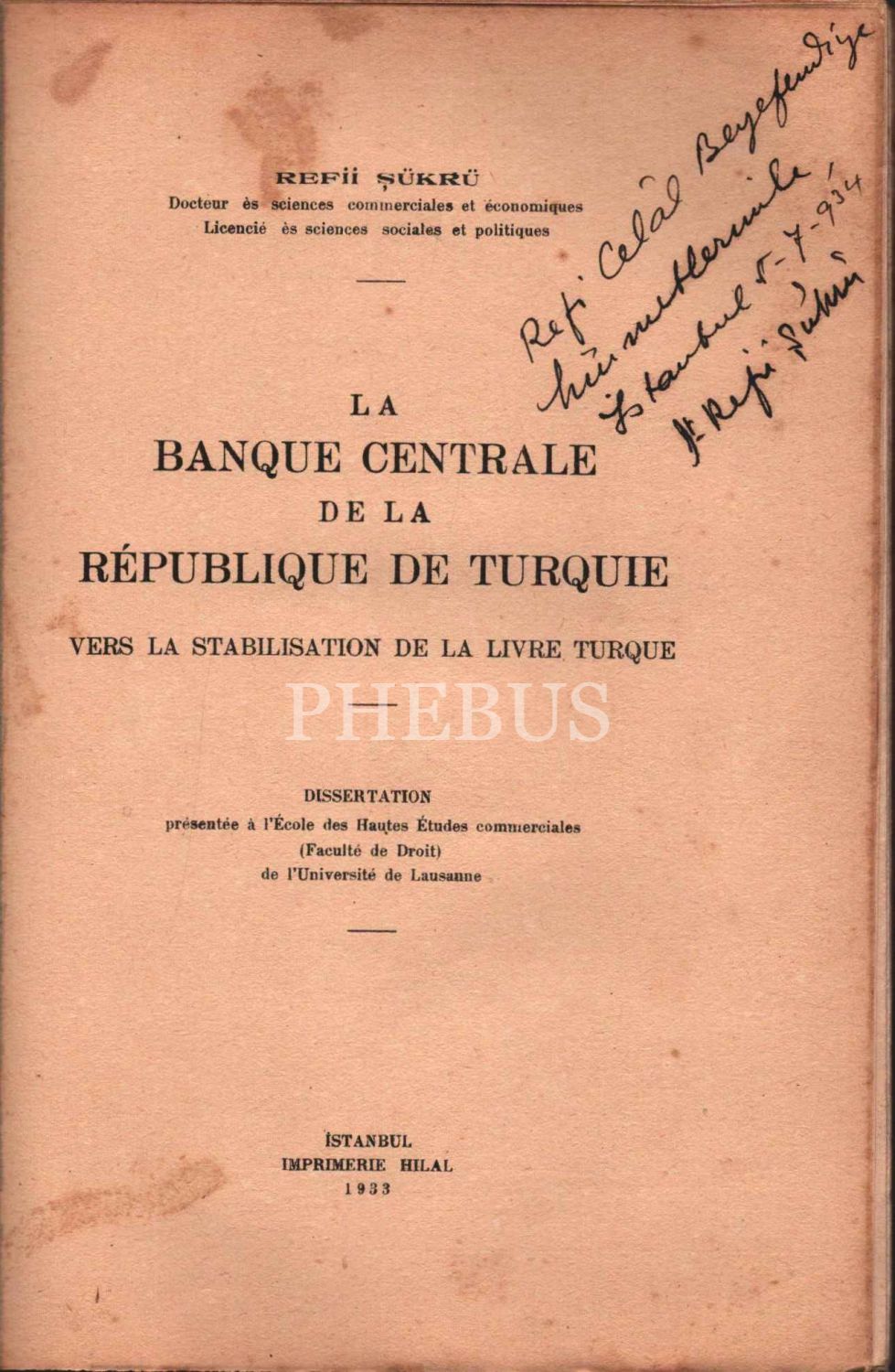 Refii Şükrü [Suvla]´den ithaflı ve imzalı LA BANQUE CENTRALE DE LA REPUBLIQUE DE TURQUIE, Imprimerie Hilal, İstanbul - 1933, 156 sayfa, 17x25 cm