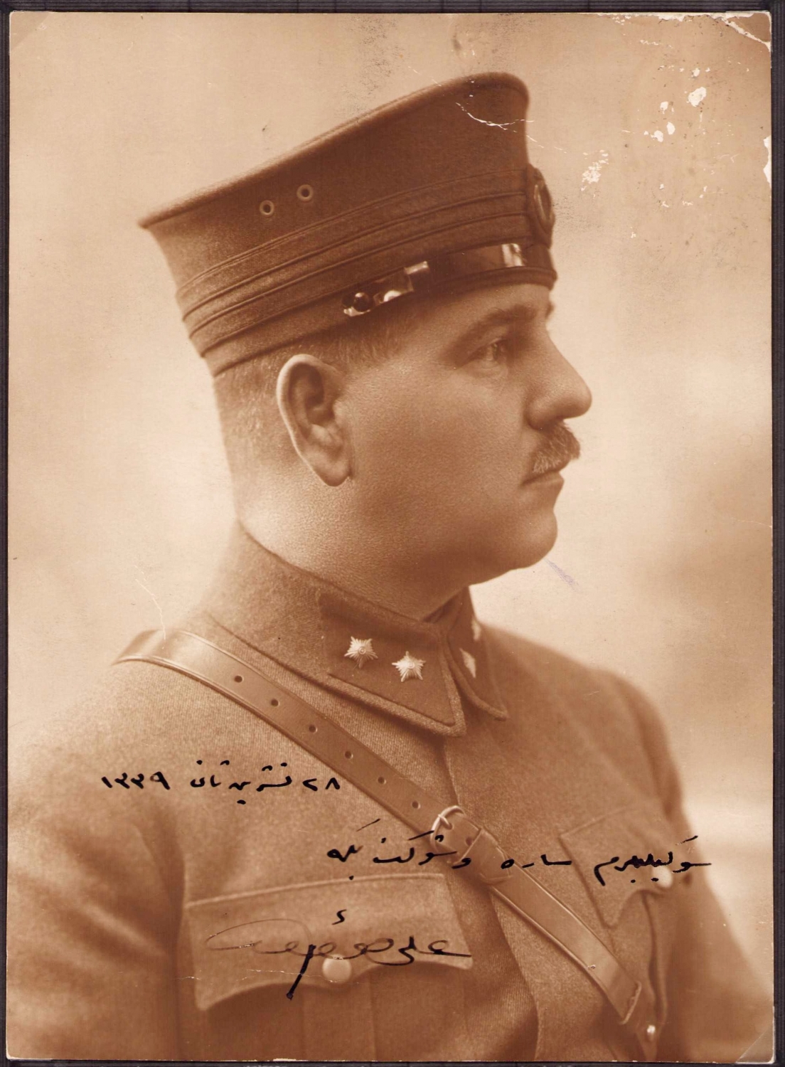 Ali Fuat Cebesoy'un 1923 tarihli askeri üniformalı Şevket ve Sare Mocan'a imzalı ve ithaflı fotoğrafı, 16x22 cm.