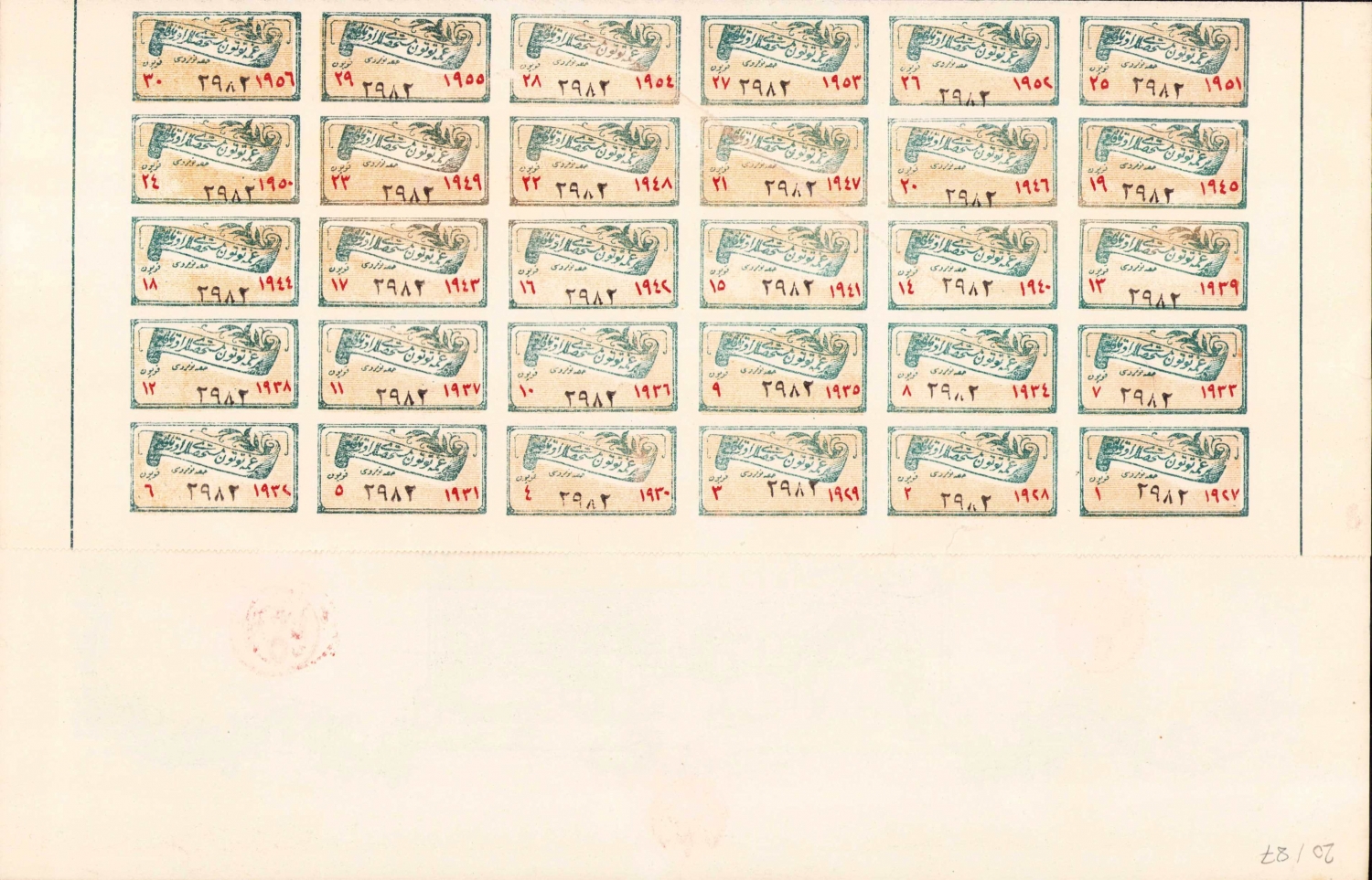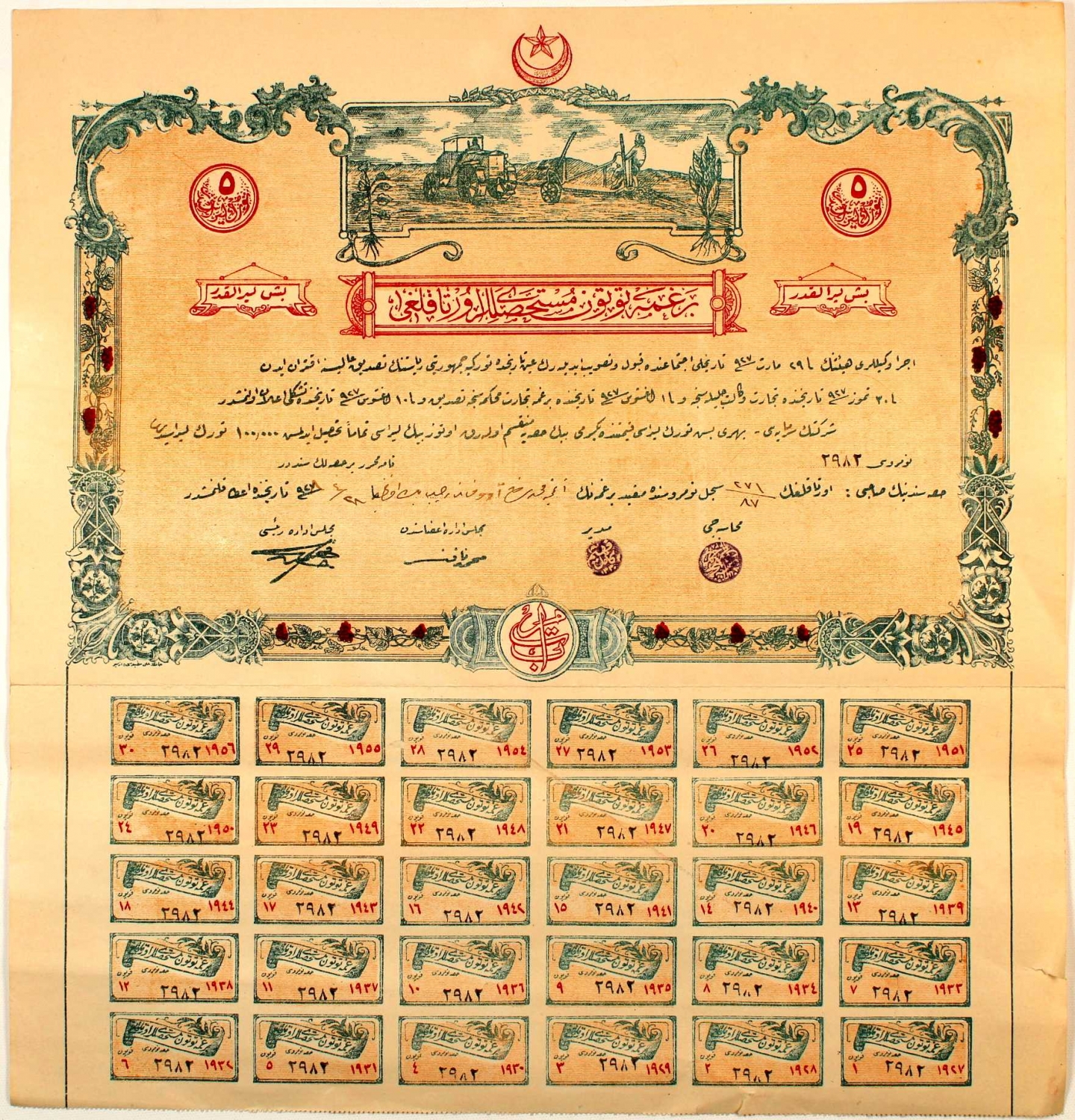 Bergama Tütün Müstahsılları Ortaklığı beş liralık hisse seneti, 38x24 cm.