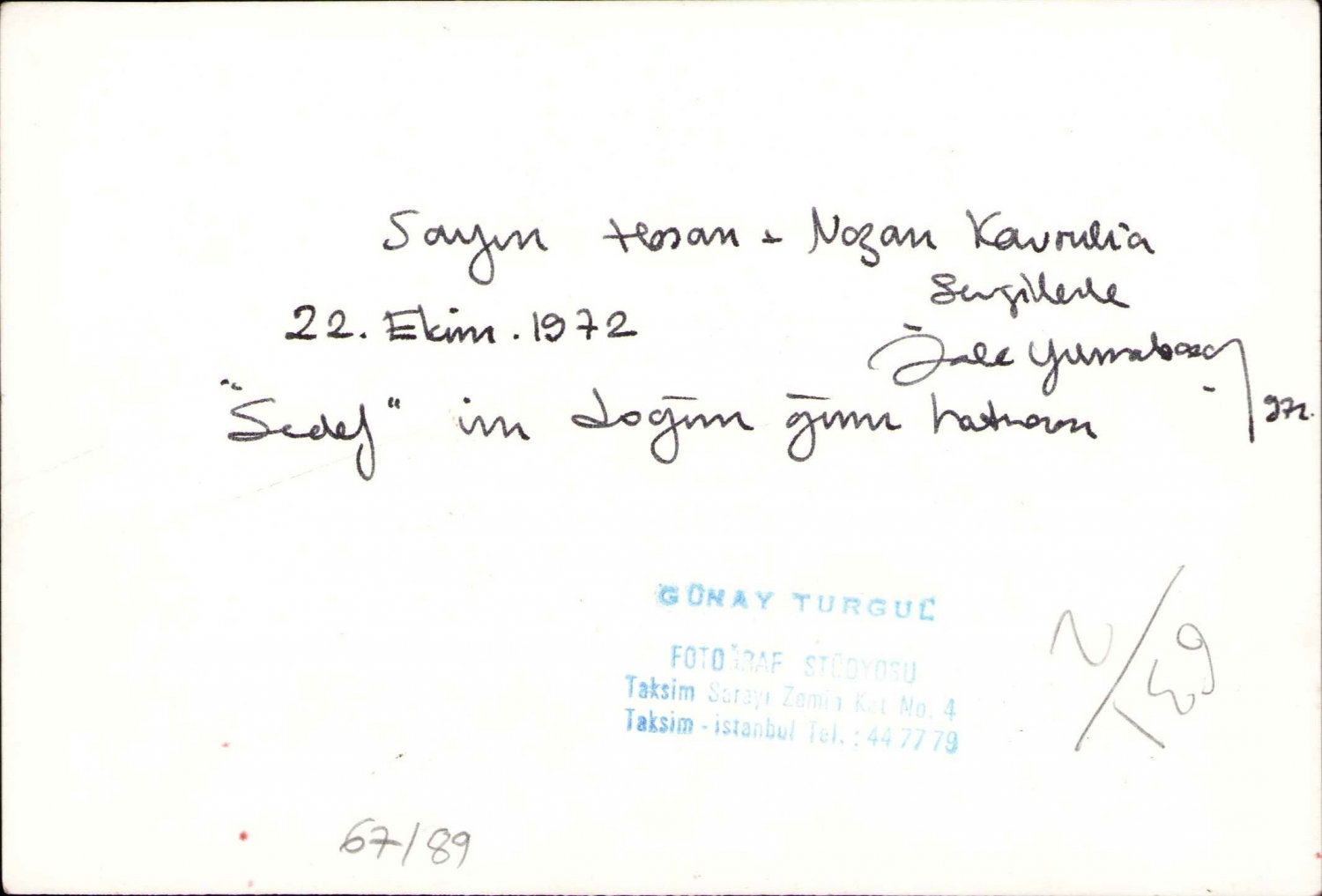 Fotoğrafın arkasındaki ithaf "Sayın Hasan-Nazan Kavruk'a sevgilerle. Sedef'in Doğum günü hatırası
