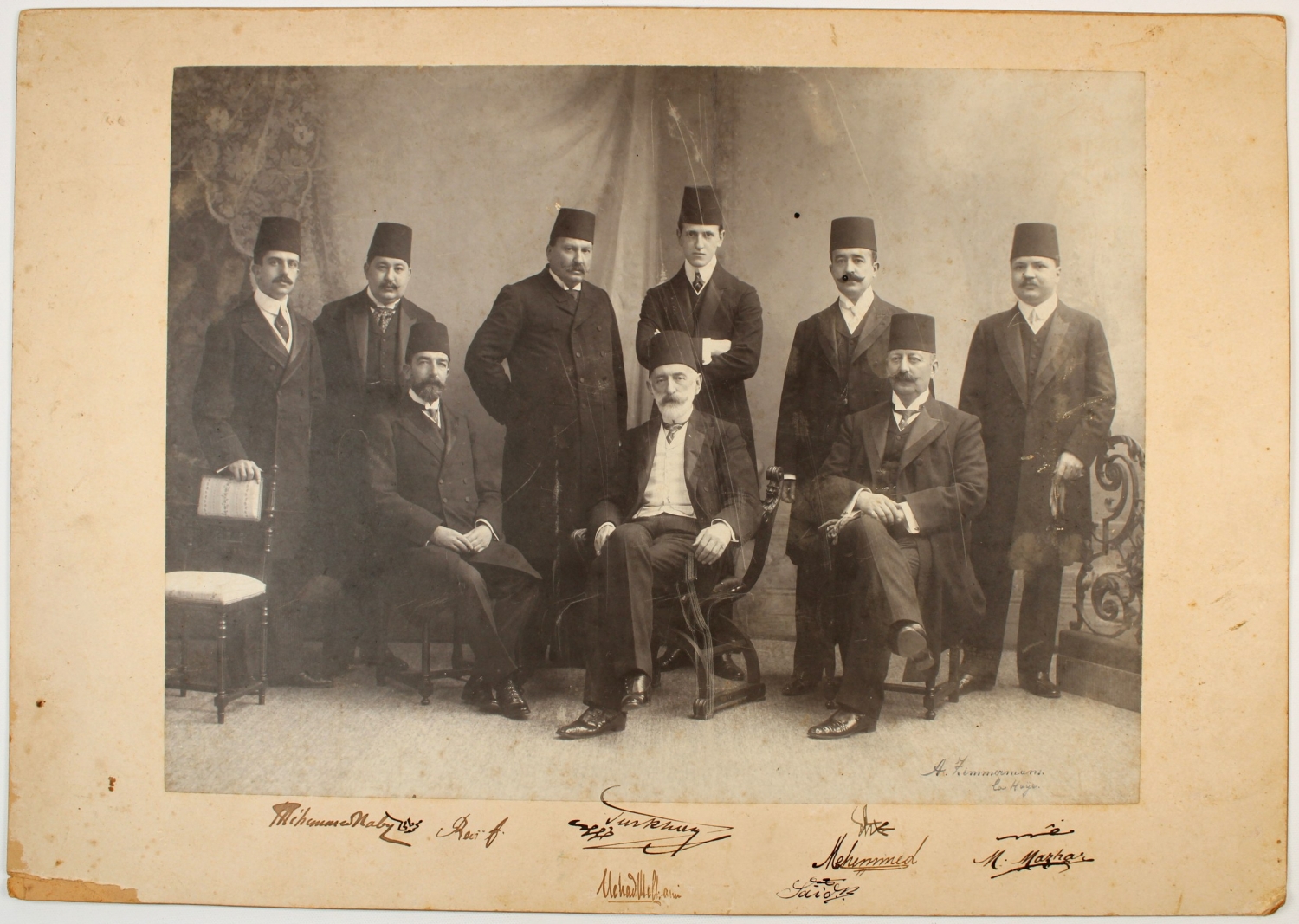 Aralarında Osmanlı'nın son Hariciye Nazırlarından Mustafa Reşid Paşa ve Mehmed Paşa'nın da bulunduğu diplomatlar hatıra kabin fotoğrafı, Lahey, imzalı, 48,5x34 cm.