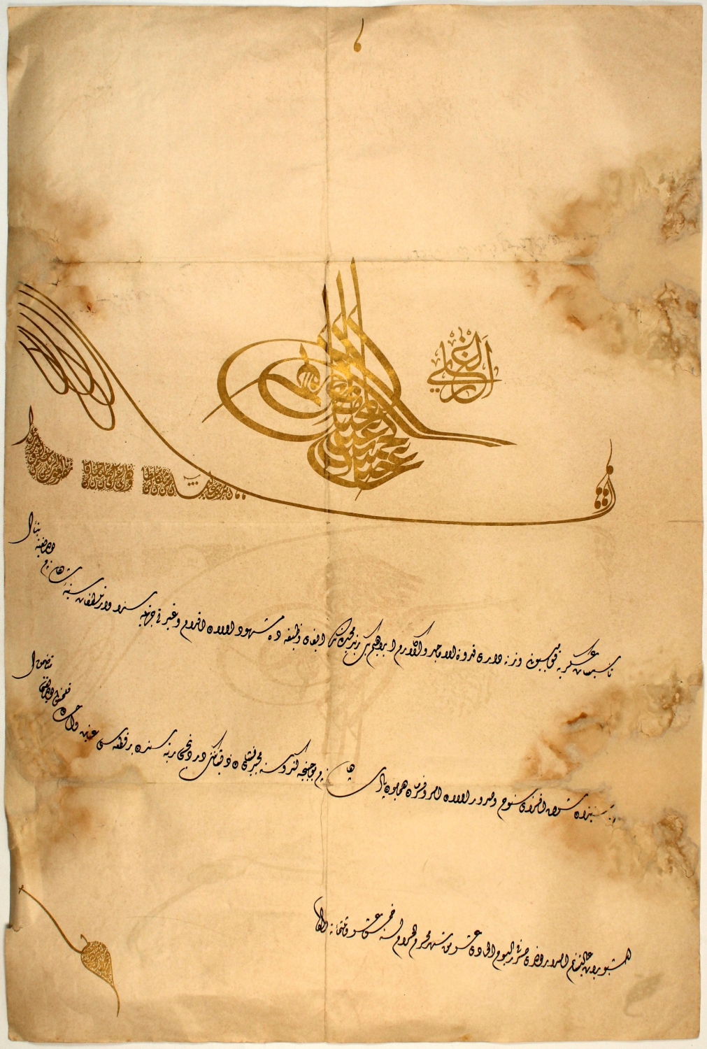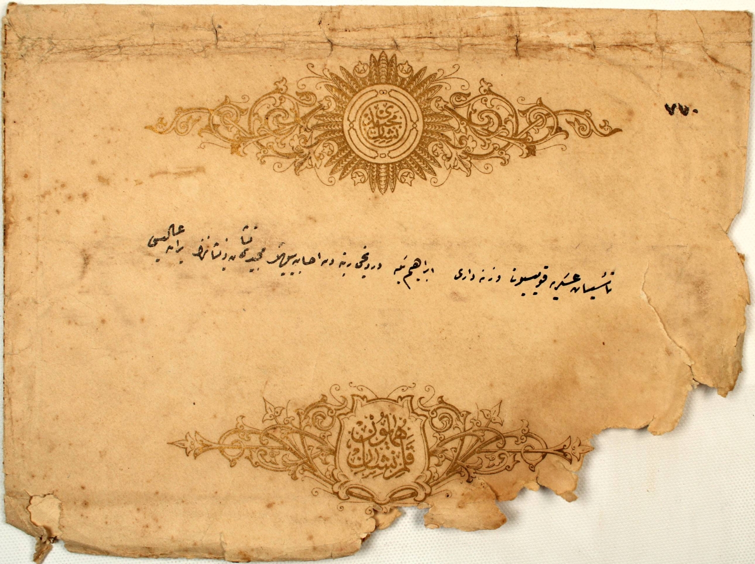 Sultan II. Abdülhamid tuğralı, Tesisat-ı Askeri Komisyon Veznedarı İbrahim Bey'e verilen 4. derece mecidi beratı, tamirli, zarf haliyle, 38x57,5 cm.
