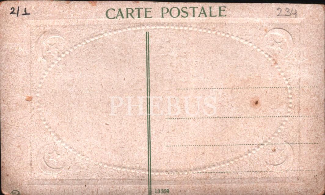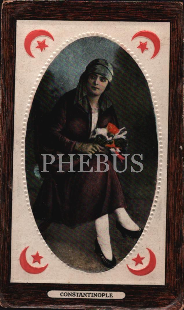 Gofre ay yıldız desenli, elinde çiçeğiyle hanımefendi kartpostalı, Constantinople, ed. MJ.B.