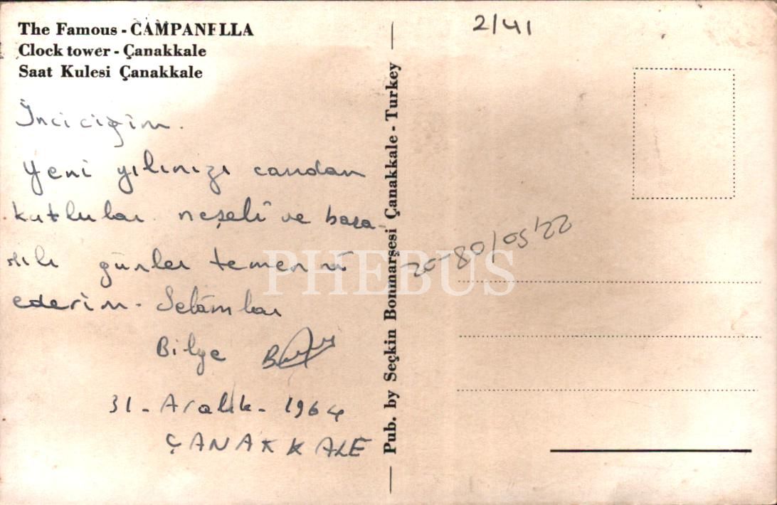 Çanakkale Saat Kulesi, Seçkin Bonmarşesi, 31 Aralık 1964 tarihli ve arkası yeni yıl tebrikli, 9x14 cm