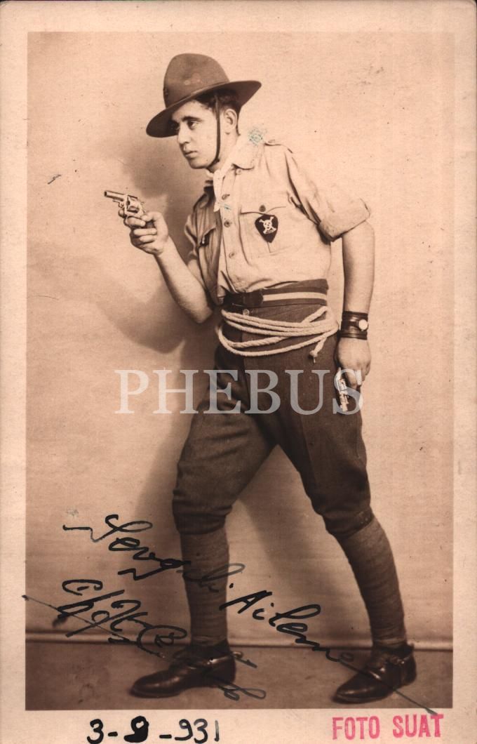 Elinde minik tabancasıyla bir izcinin ailesine ithaflı ve imzalı hatıra fotoğrafı, Foto Suat, 3 Eylül 1931, 9x14 cm