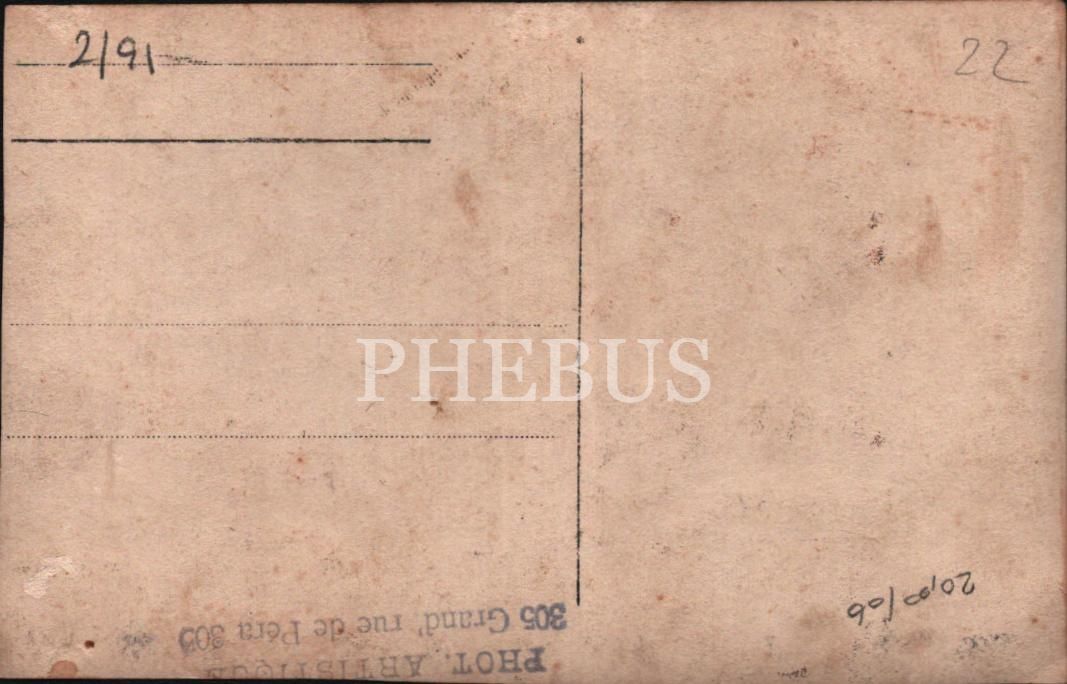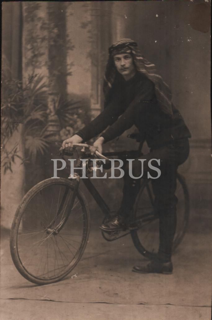 Başında örtüsü ve bisikletiyle poz veren beyefendinin stüdyo fotoğrafı, Foto Artıstıque Pera, 9x14 cm