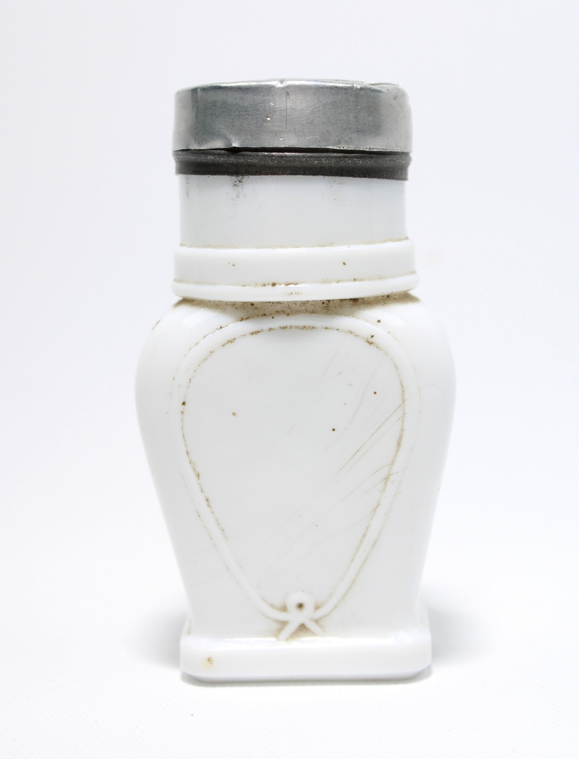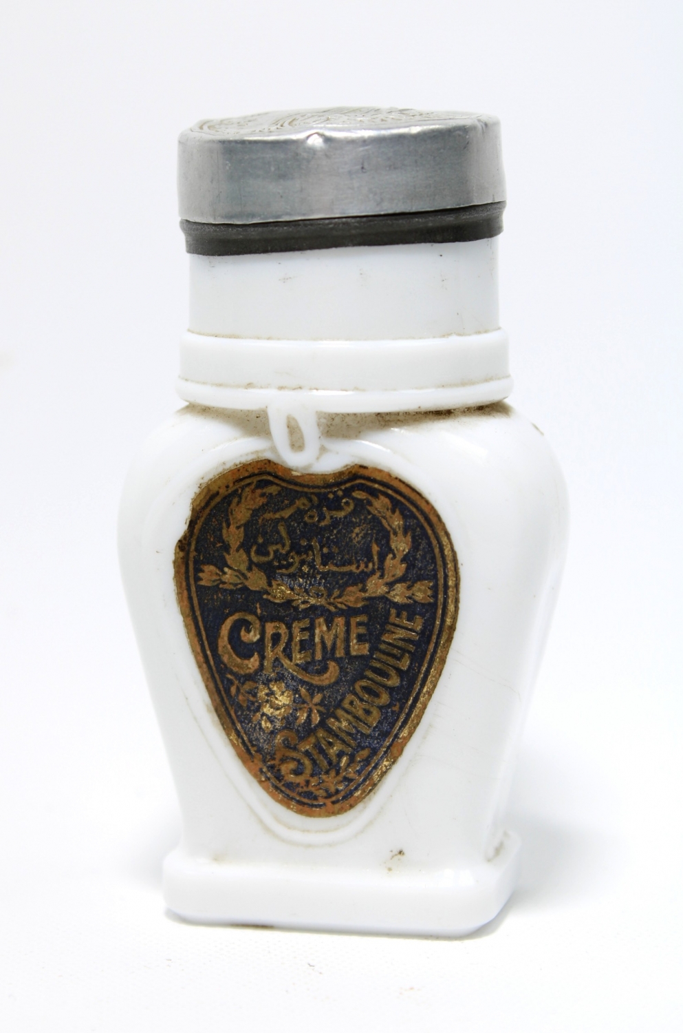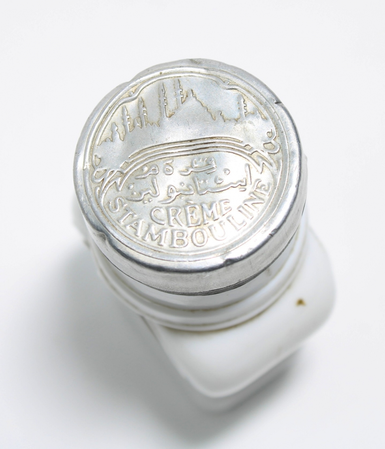Osmanlıca Fransızca iki dilde Stambouline Creme etiketli ve kapaklı, opalin krem şişesi, 3x7 cm.