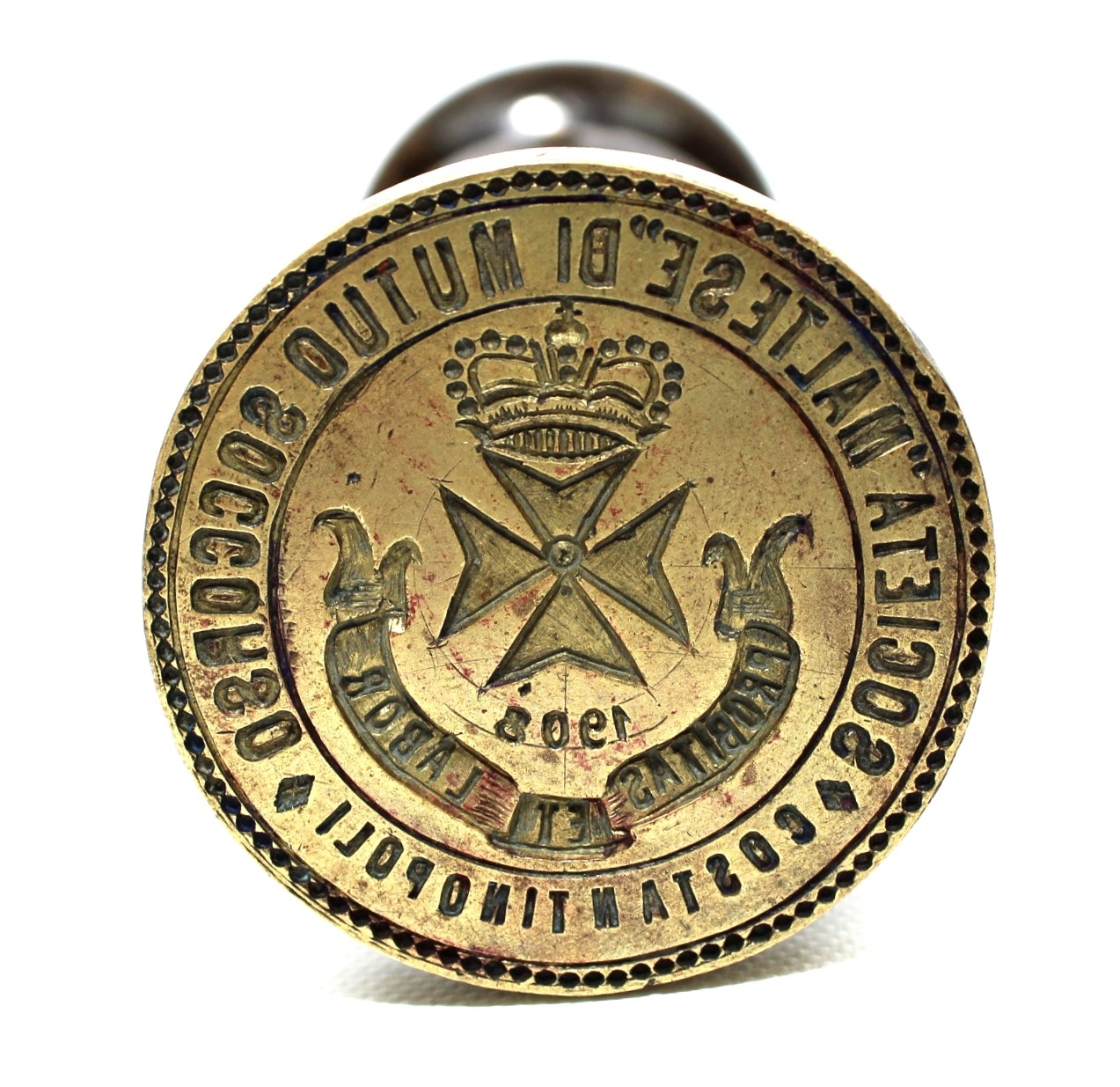 Osmanlı dönemi İstanbul'da bulunan Malta Konsolosluk mührü, Societa Maltese Di Mutuo Soccorso Costantinopoli 1908 yazılı, 6x4x21 cm