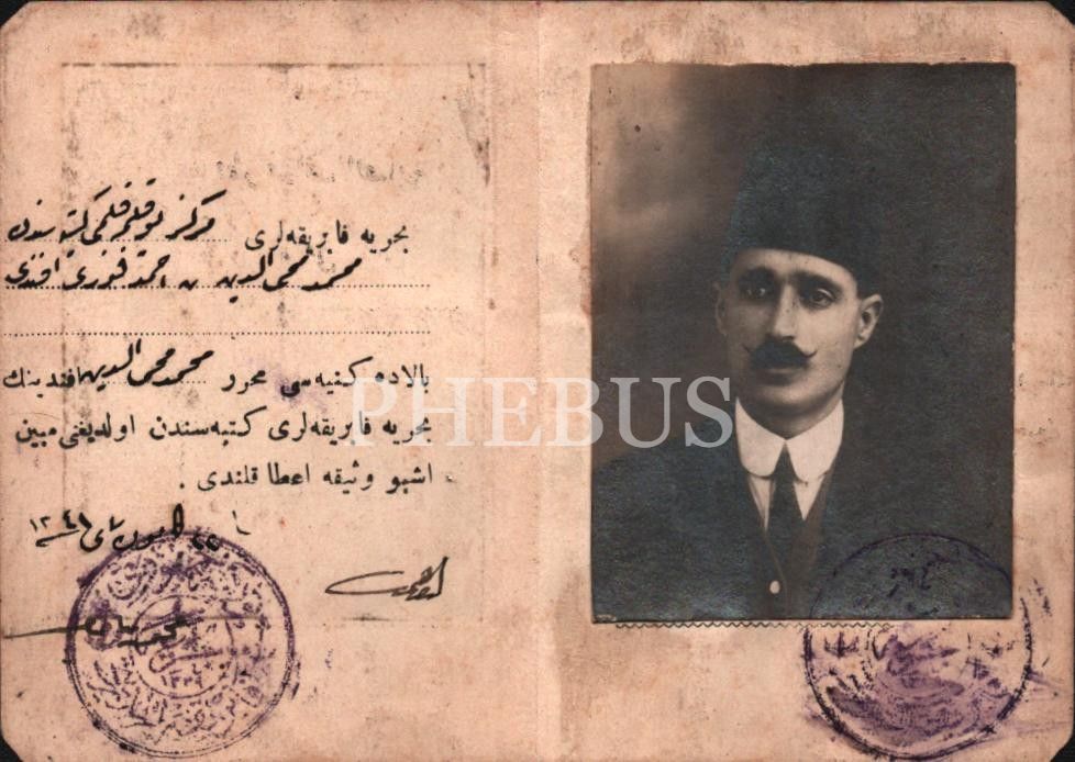 Merkez Yoklama Kalemi kâtiplerinden Mehmed Muhyiddin Beyefendi´ye ait fotoğraflı kimlik kartı, 1341, 9x13 cm