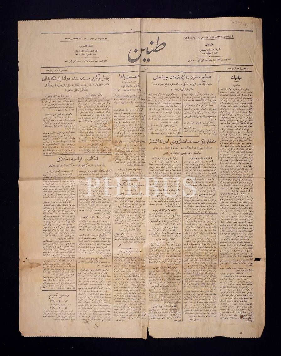 TANİN gazetesinin 29 Cemaziyelahir 1341 tarihli sayısı, 43x60 cm