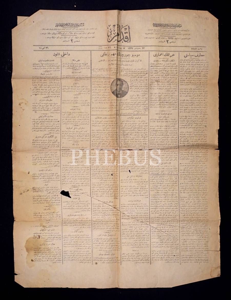 Günlük olarak yayımlanan siyasî, ilmî İKDAM gazetesinin 26 Mart 1919 tarihli sayısı, 48x66 cm