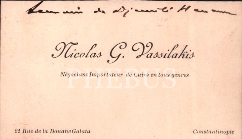 Her türlü deri ticareti ve ithalatçısı Nicolas G. Vassilakis´e ait kartvizit, Constantiople/Galata