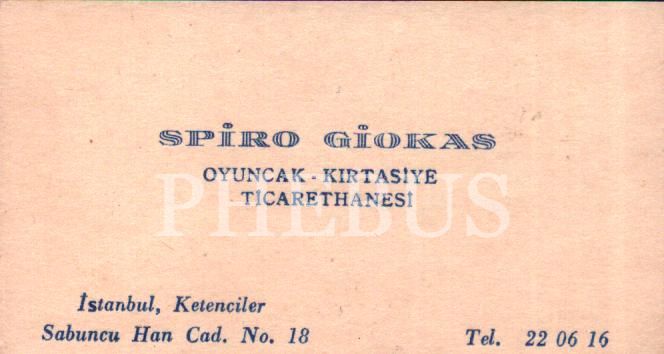 Oyuncak-Kırtasiye Ticarethanesi Spiro Giokas´a ait kartvizit, Ketenciler/İstanbul