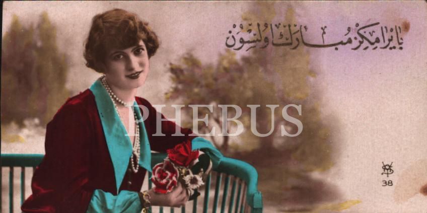 Üzerinde "Bayramınız mübarek olsun" yazılı kadın görselli tebrik kartı, ed.YSA, 5x11 cm
