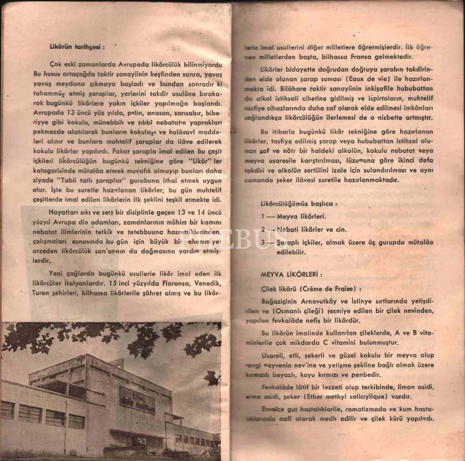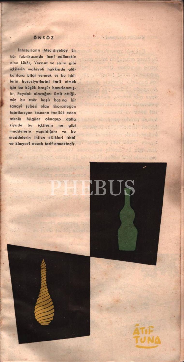"İnhisarların Mecidiyeköy Likör Fabrikasında imal edilmekte olan likör, vermut vs. gibi içkilerin mahiyeti hakkında alakalılara bilgi vermek vu bu içkilerin hususiyetlerini tarif etmek için bu küçük broşür hazırlanmıştır."