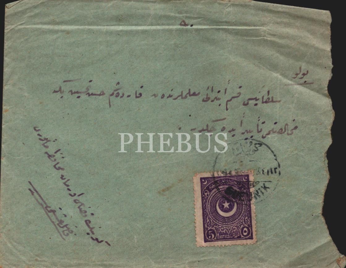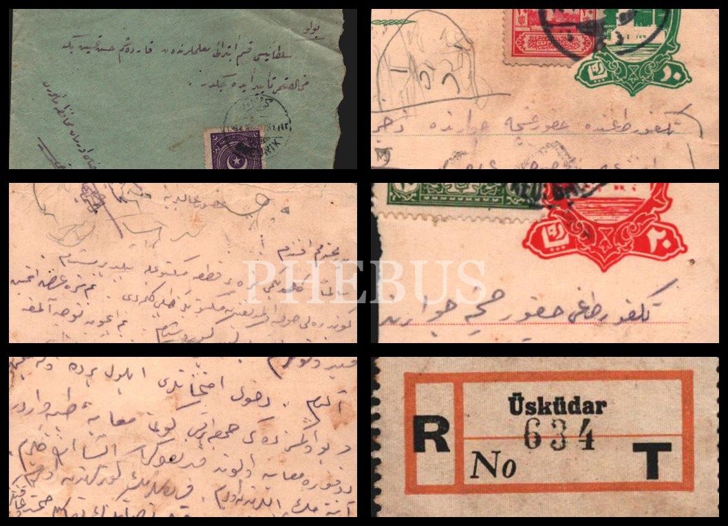 Postadan geçmiş zarf, Kız Kulesi görselli damgalı ve pullu iki adet kart ve Üsküdar yazılı pulun bulunduğu 4 adet efemera