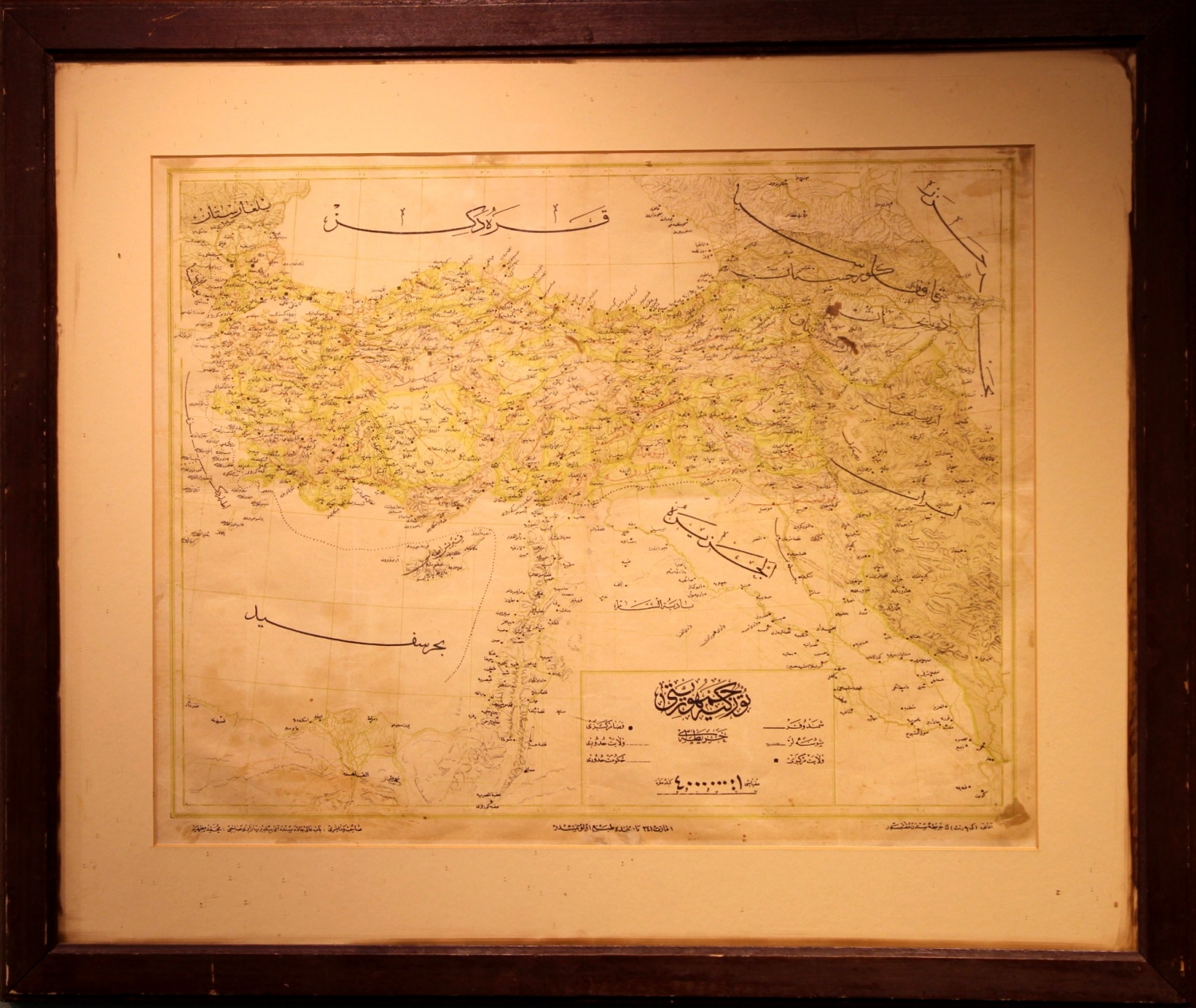 Osmanlıca Türkiye Cumhuriyeti Haritası, 1341 tarihli, Mikyası: 4, 000,000:1, Sahib u Naşiri Bab-ı Ali Caddesi'nde Al Yıldız Pazarı, Sahibi: Muhammed Mazhar, çerçeveli, 75x65 cm.
